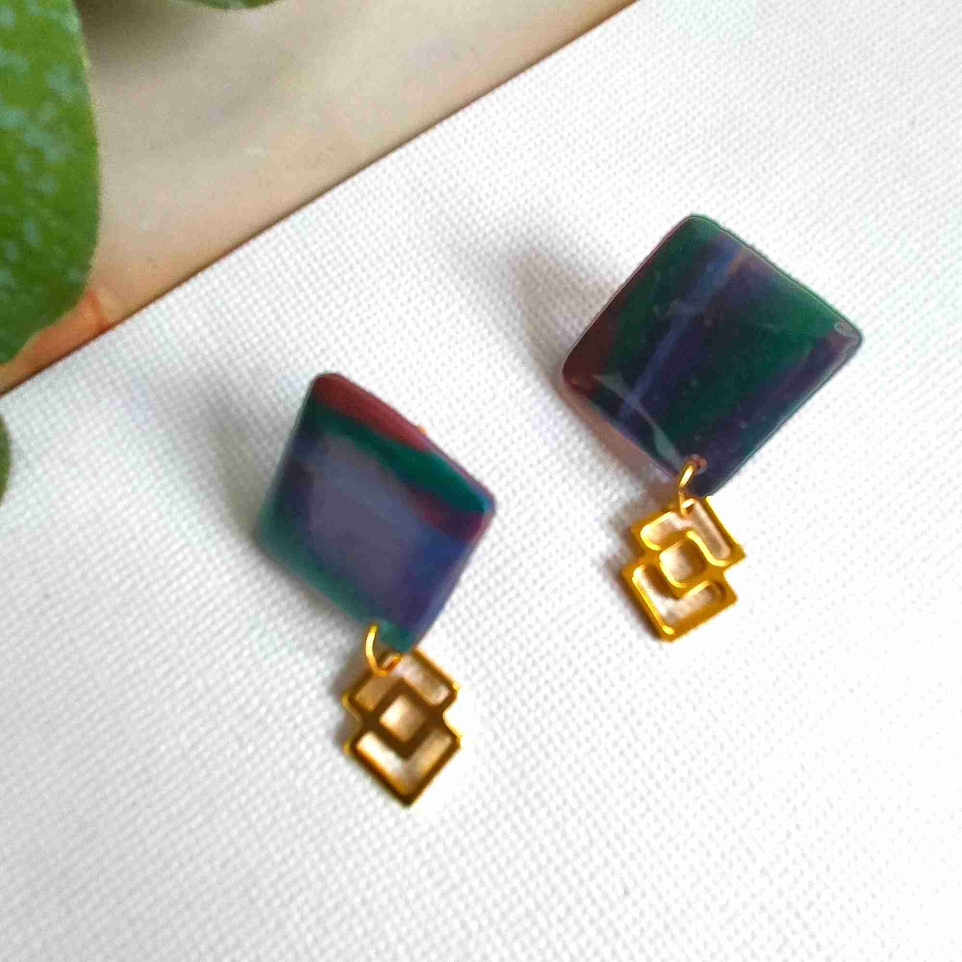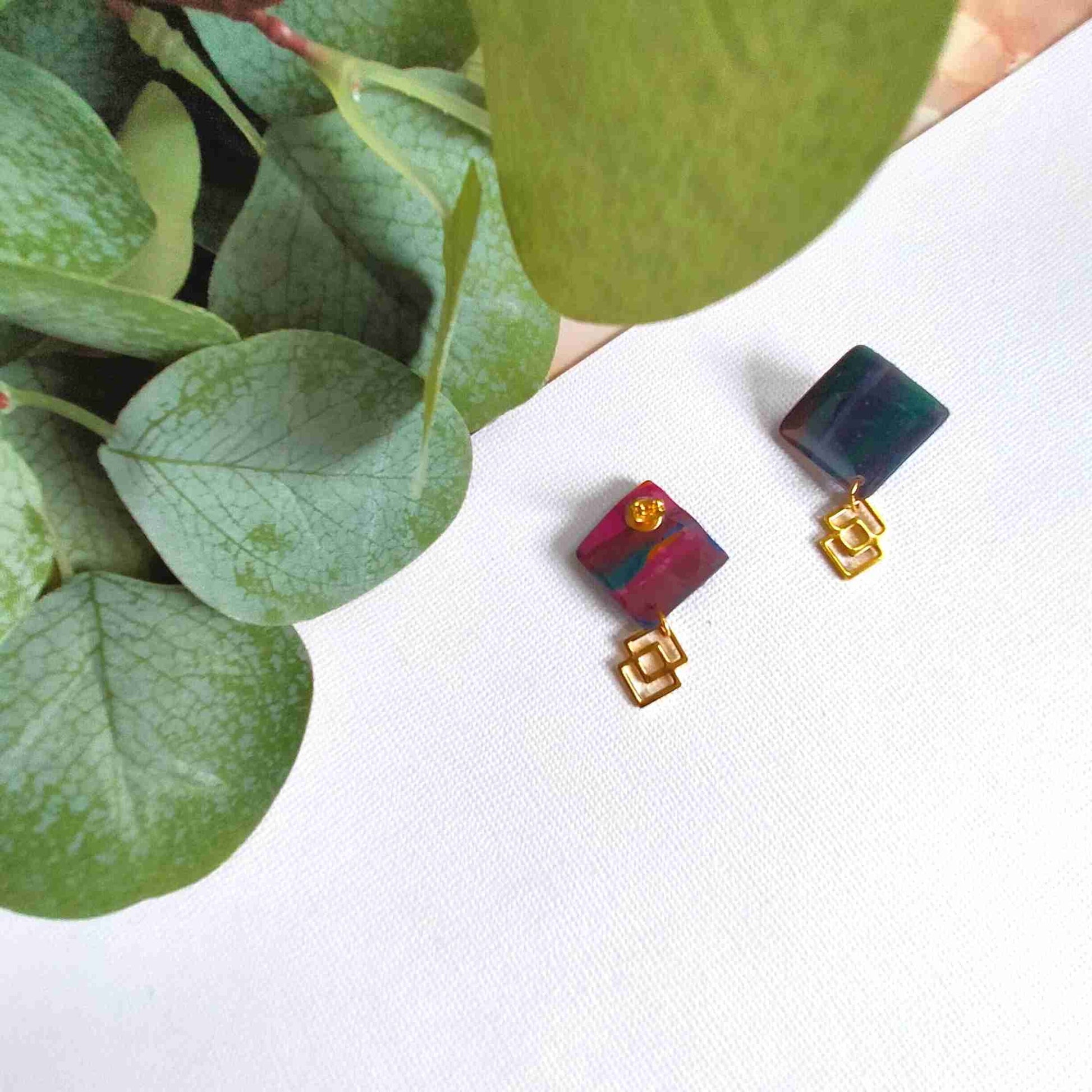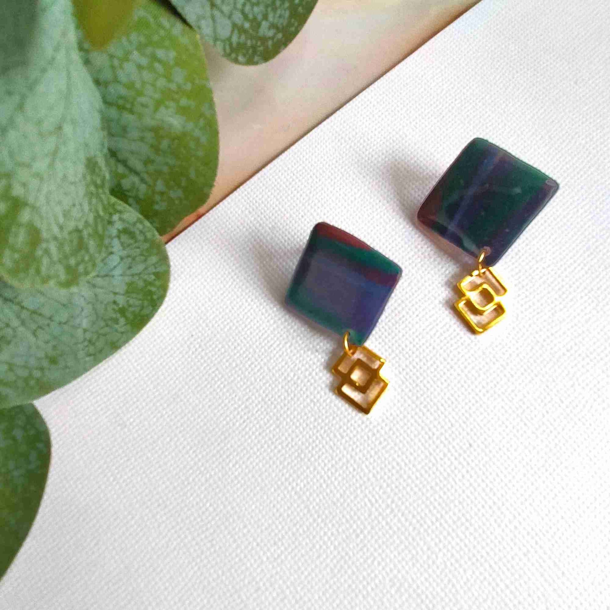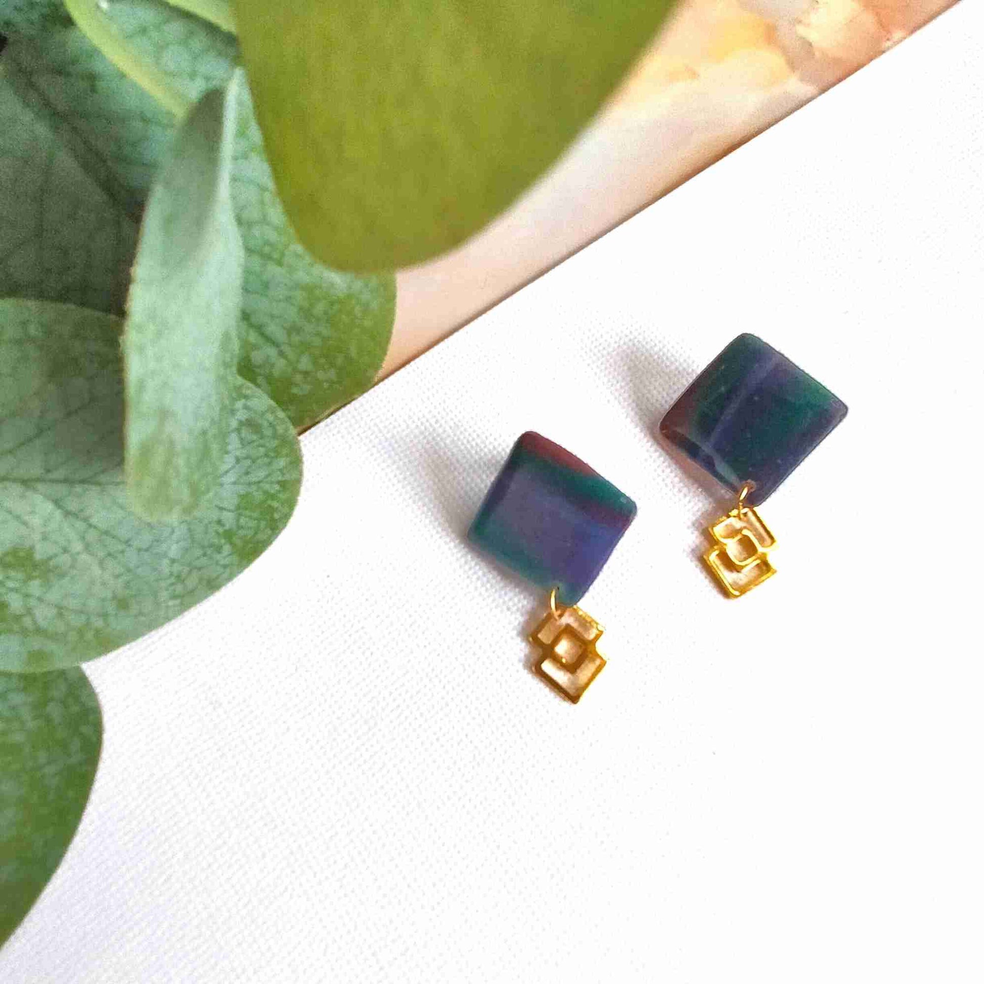 These lovely earrings are handmade from polymer clay. They have a square shape that has been mounded in a diamond shape and completed with a gold stainless steel square interlinked charm which sits in the bottom of the earrings making them perfect for everyday wear, that little bit special for evening wear or an evening on the town.