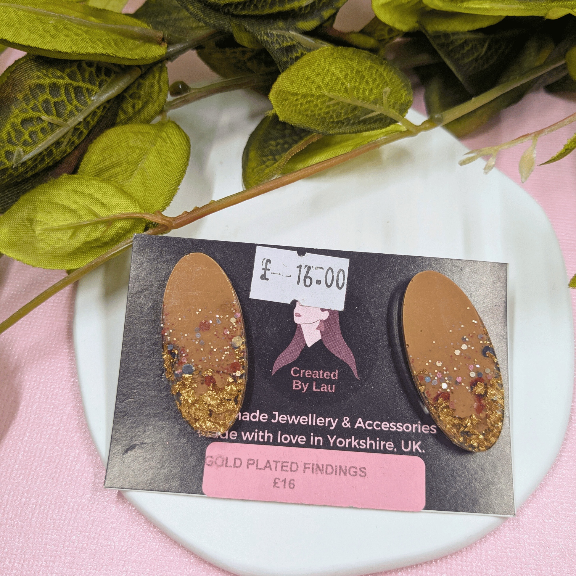 Meet "Lucia" – your new everyday sparkle! These elegant oval stud earrings feature a dreamy beige resin base sprinkled with delicate cupcake glitter and luxurious gold leaf. Set in classic gold-plated studs with secure scrolls, they offer a subtle touch of glamour that’s perfect for any occasion. Each pair is lovingly handmade by Lau, adding a unique touch of Yorkshire charm to your style.