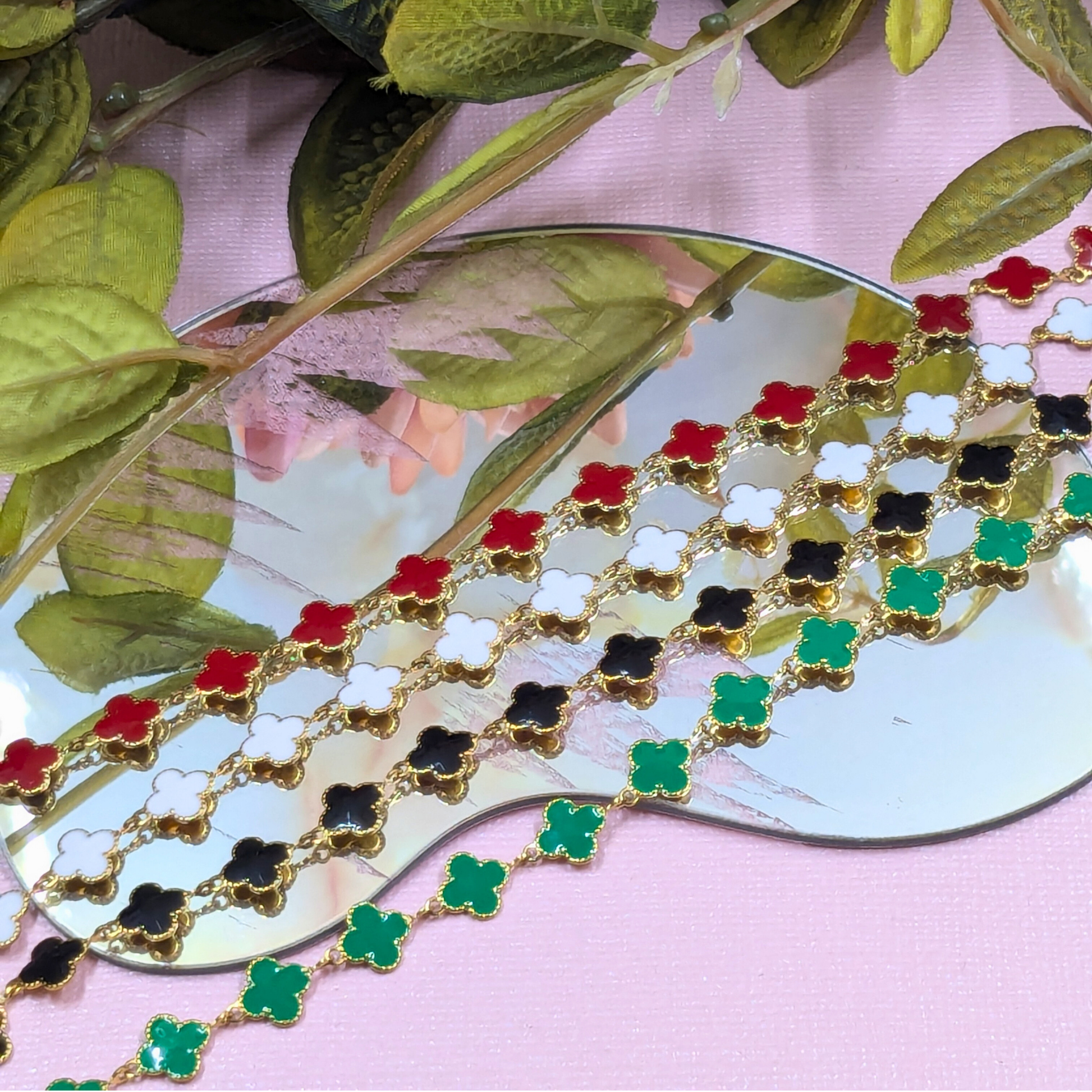 Perfect for those who adore the sleek, continuous look of permanent jewellery but love the flexibility of a clasp, the "Lyon" Gold Red Clover is an ideal choice. It features a stunning gold chain adorned with bold red enamel clover charms, creating a truly eye-catching statement piece that exudes confidence and personality. It’s perfect for adding a pop of vibrant colour to any outfit.