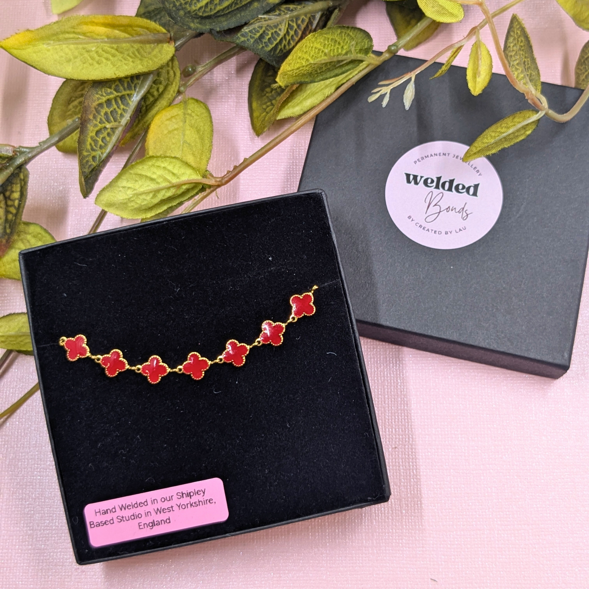 Make a statement with the vibrant "Lyon" Gold Stainless Steel Red Enamel Clover Chain Bracelet, a striking piece from our Welded Bonds Ready-to-Wear Collection. Each bracelet is meticulously hand-welded in my Shipley, Yorkshire studio, ensuring that exceptional Created By Lau quality and unique, high-fashion flair.