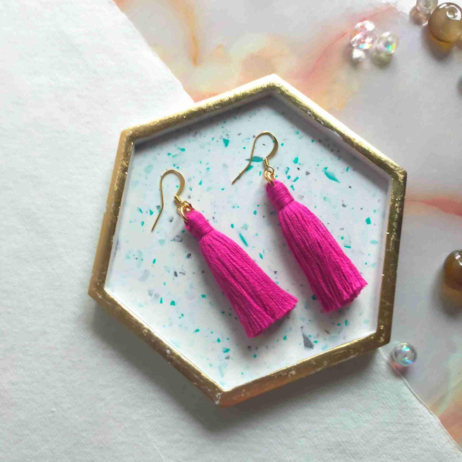 Need a place to store your jewellery? Why not treat yourself or a friend to this hexagon jewellery trinket tray in a pink colour block with marble in cream and black with gold leaf edging made from Jesmonite.
