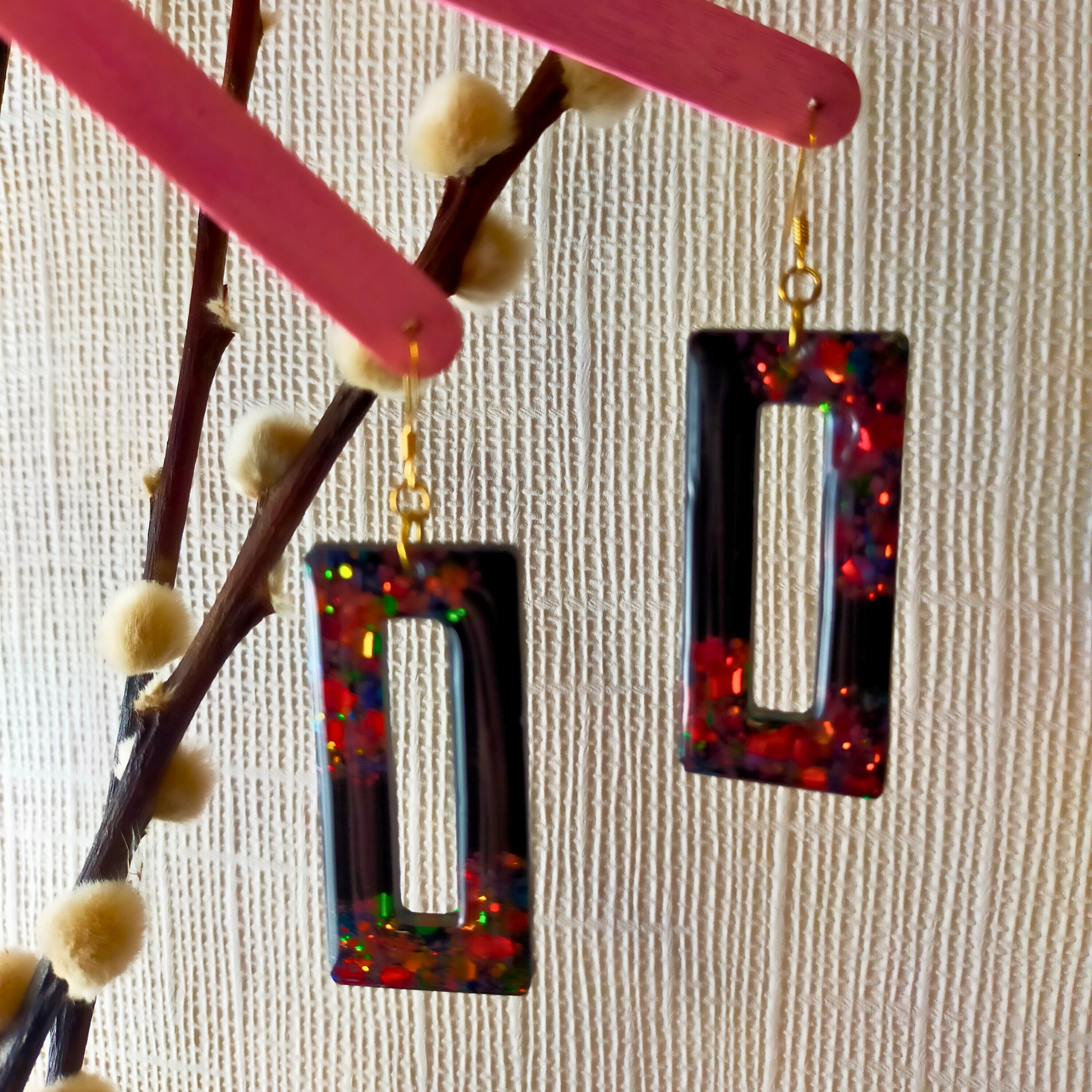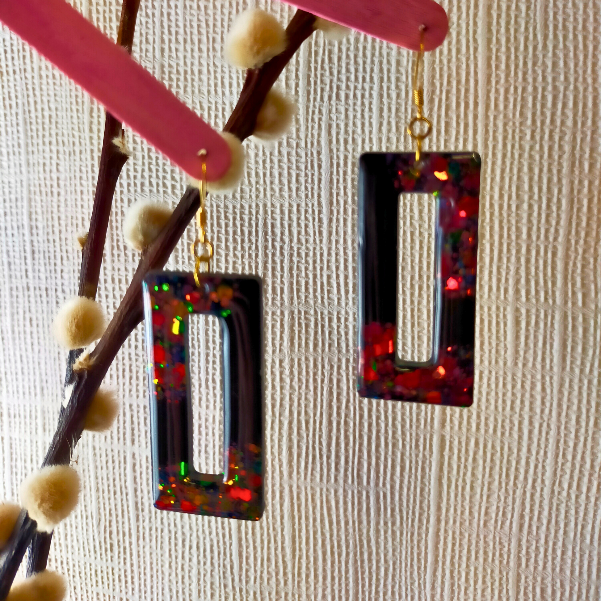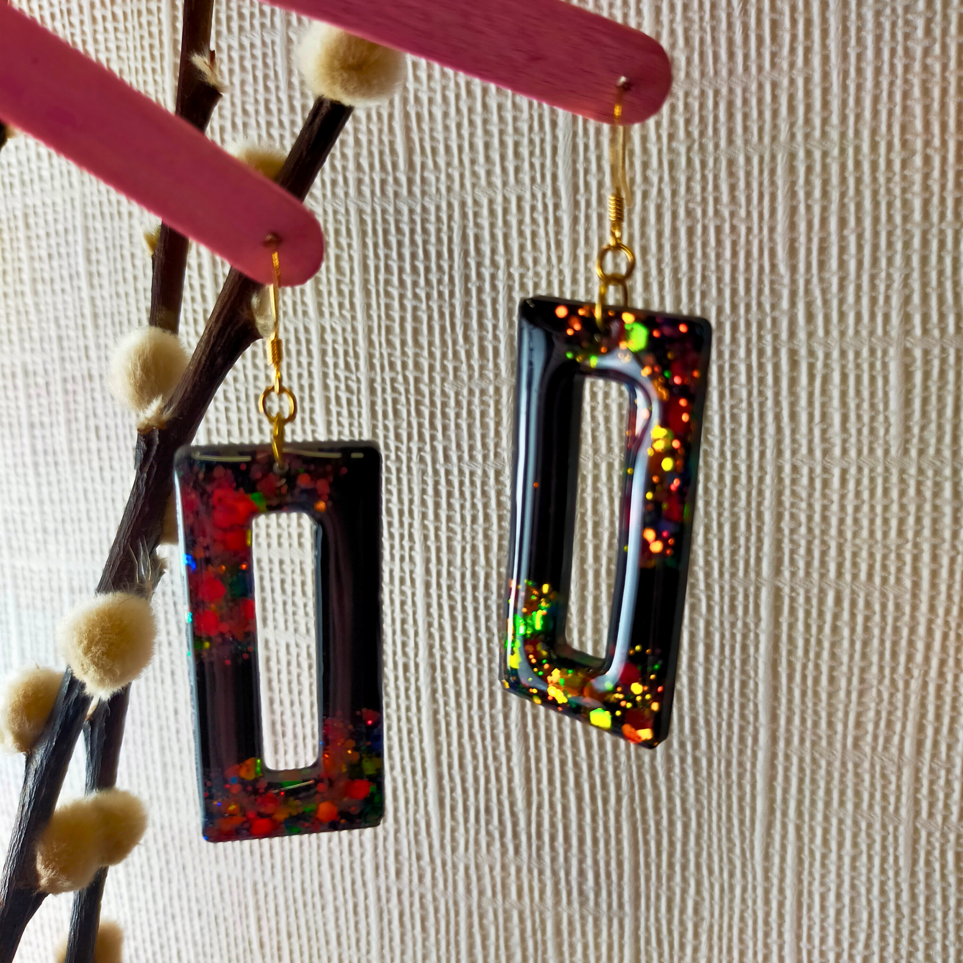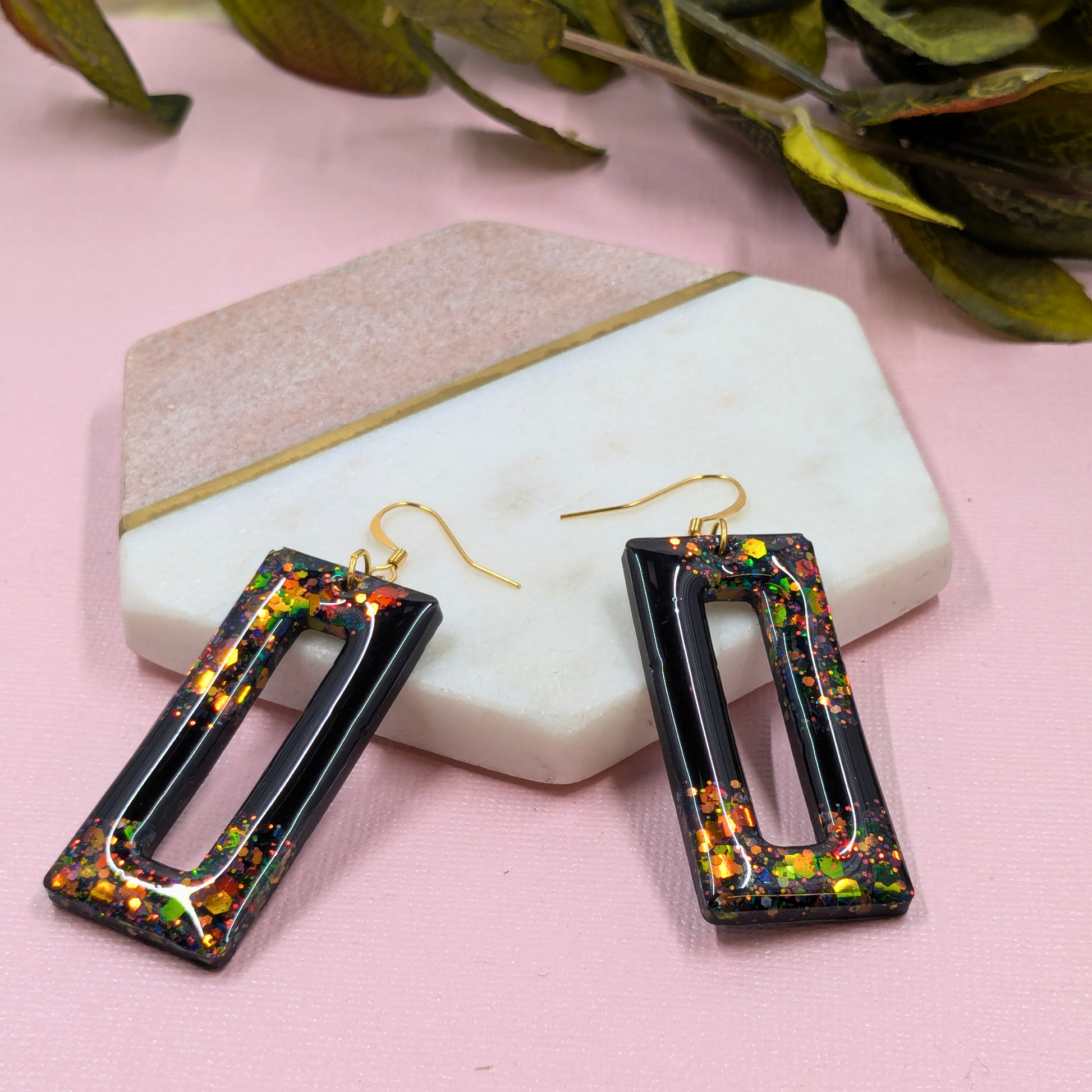"Nora" Black & Autumn Glitter Rectangle Cut out Resin Dangle Earrings