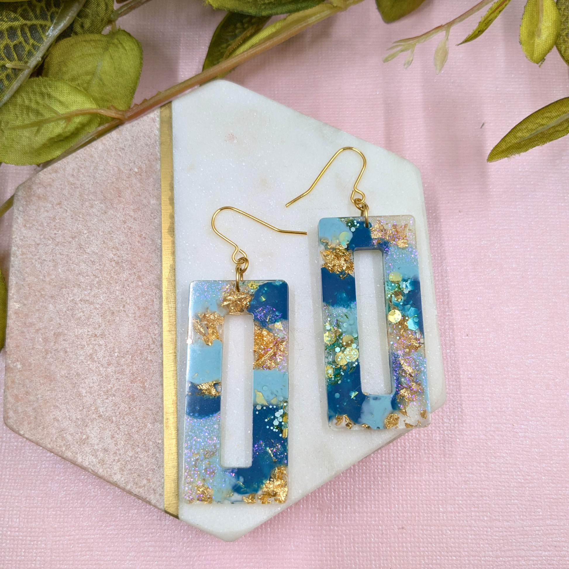 These bold and beautiful earrings feature a striking rectangle cutout design, filled with a mesmerising blend of teal and blue pigments, shimmering with exquisite gold glitter and delicate gold foil. The vibrant colours and subtle sparkle are perfectly complemented by elegant gold-plated hooks, adding a touch of luxury to this eye-catching design.