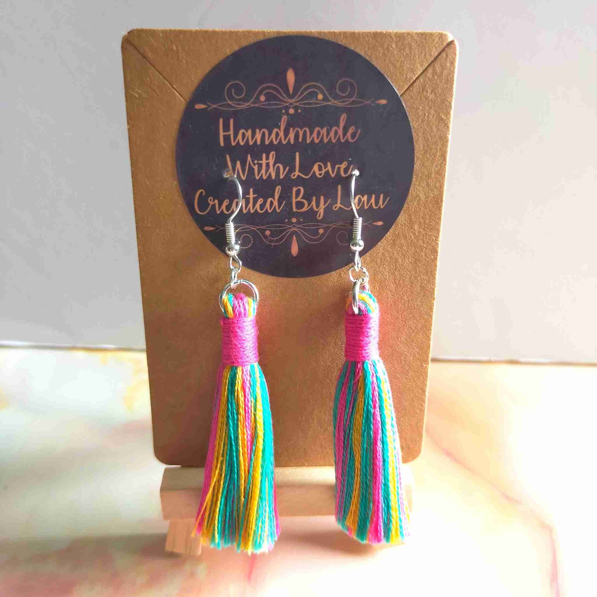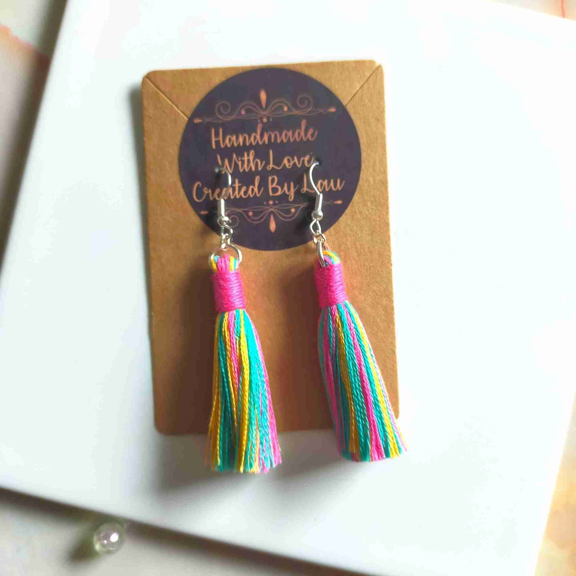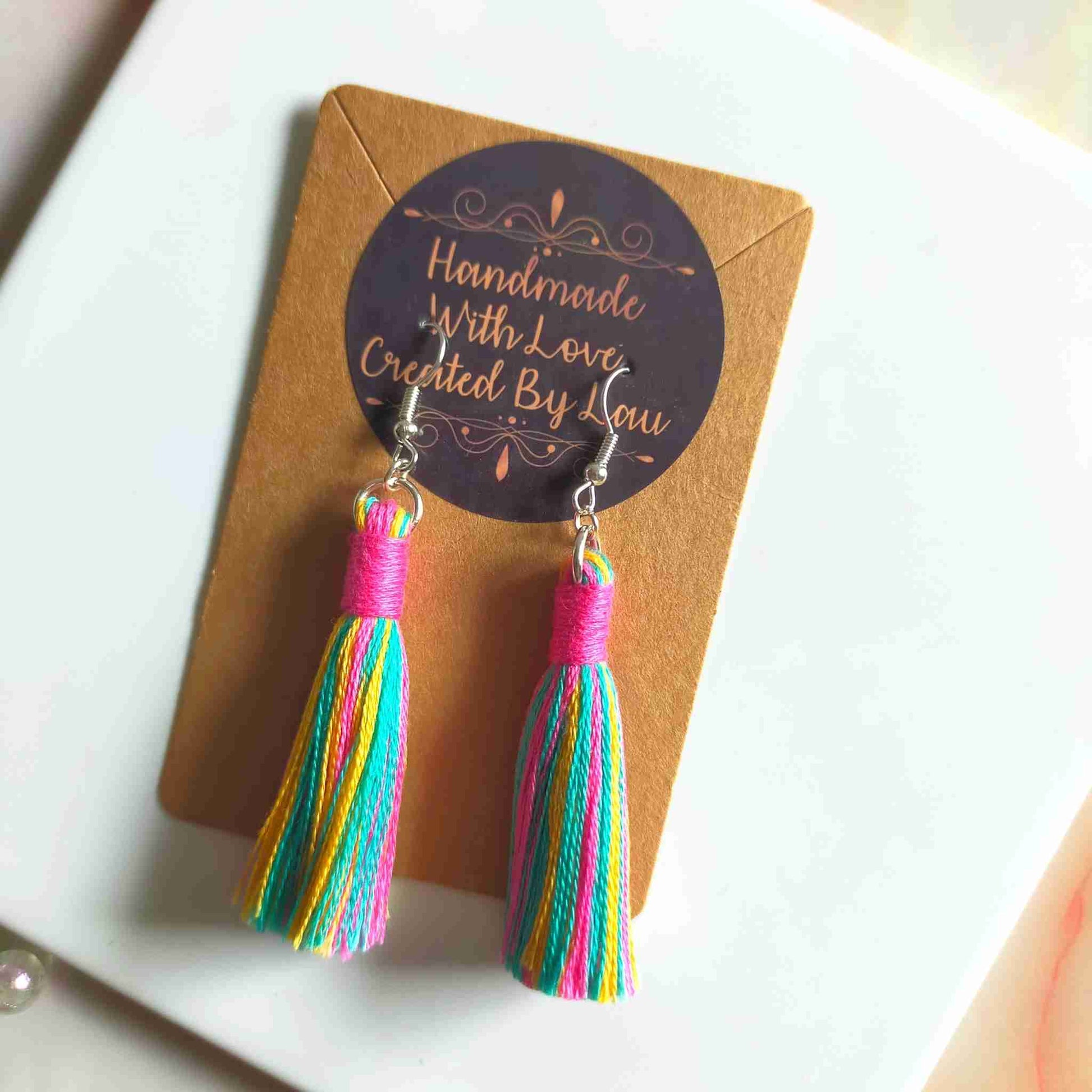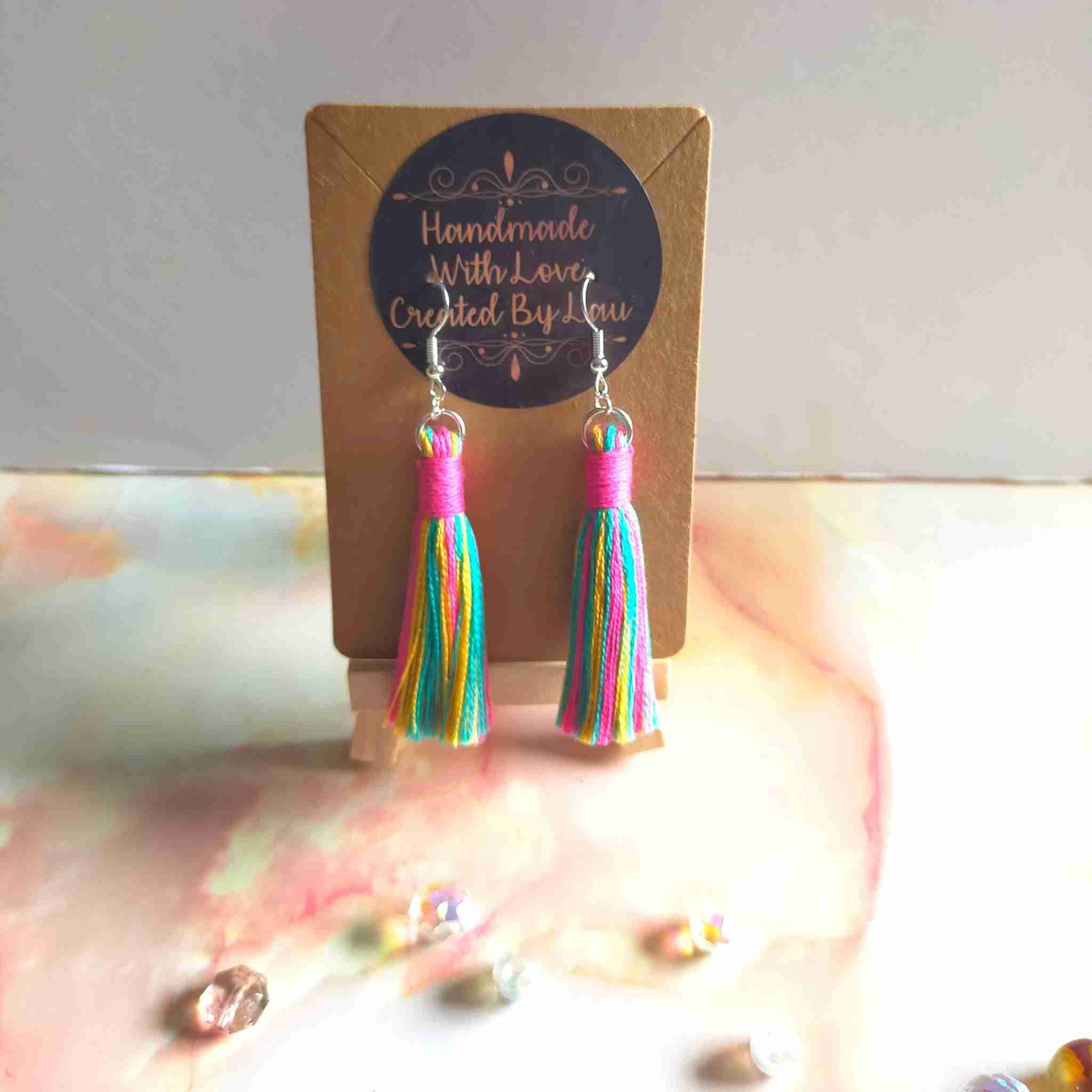 Our "Fallon Mini" 3 colours with contrast Tassel Earrings have been handmade with love. These earrings feature a beautiful combination of aqua, yellow and pink 100% cotton thread, and have been finished with silver plated findings and hooks. They're the perfect accessory for anyone who loves boho style. At Created By Lau, we believe that fashion should be fun, and these earrings are the perfect way to add a touch.