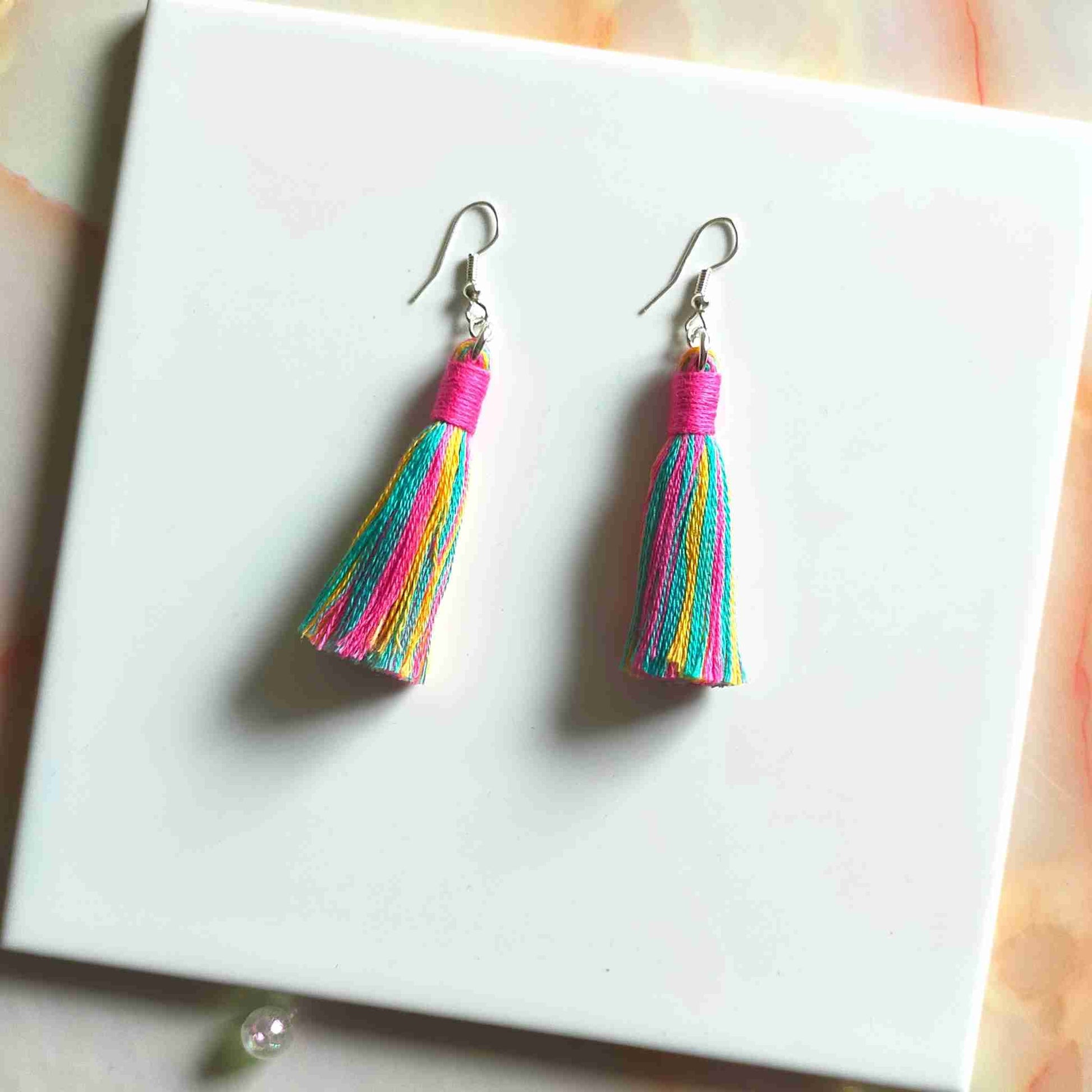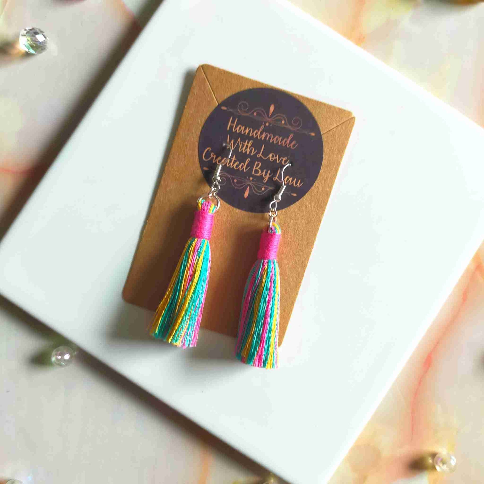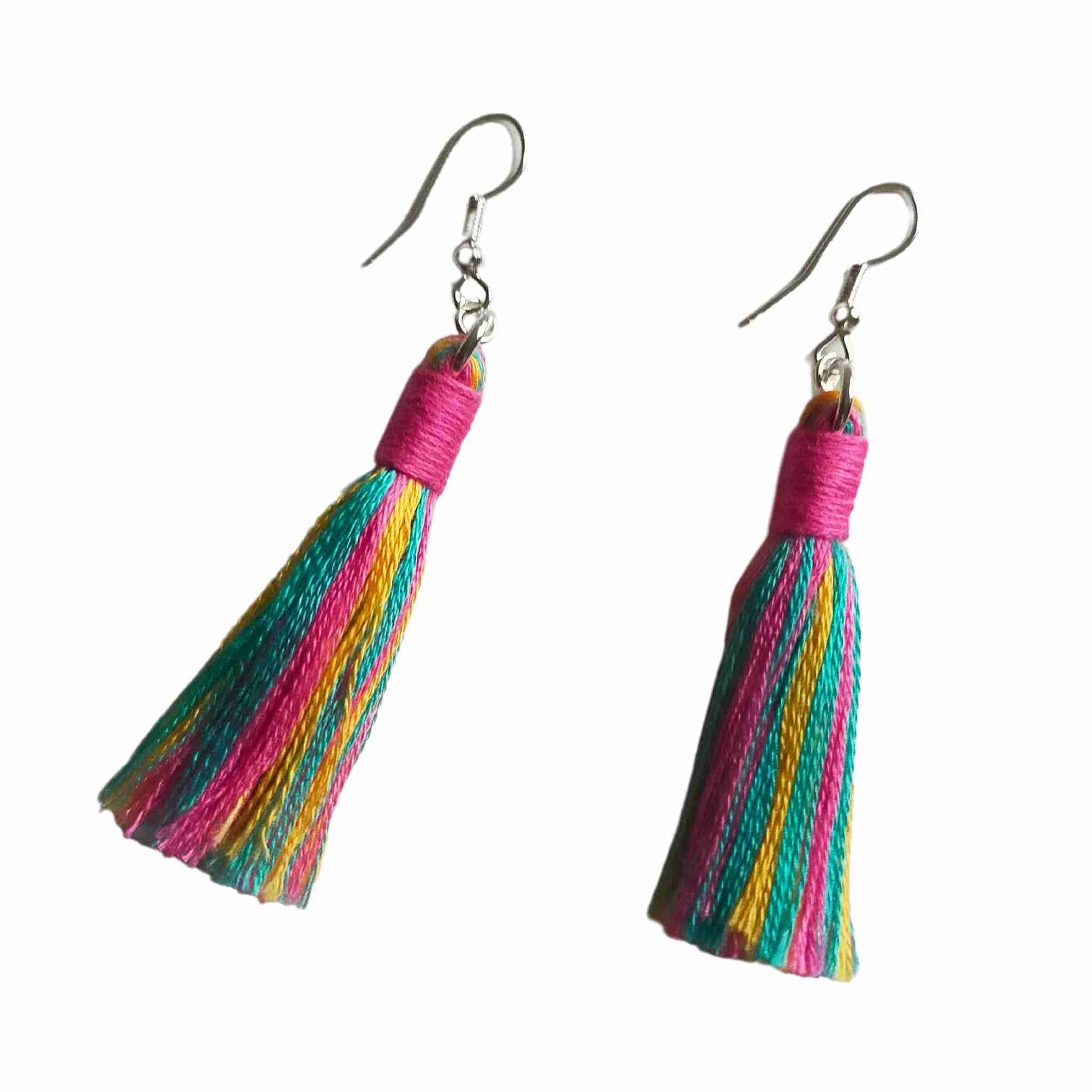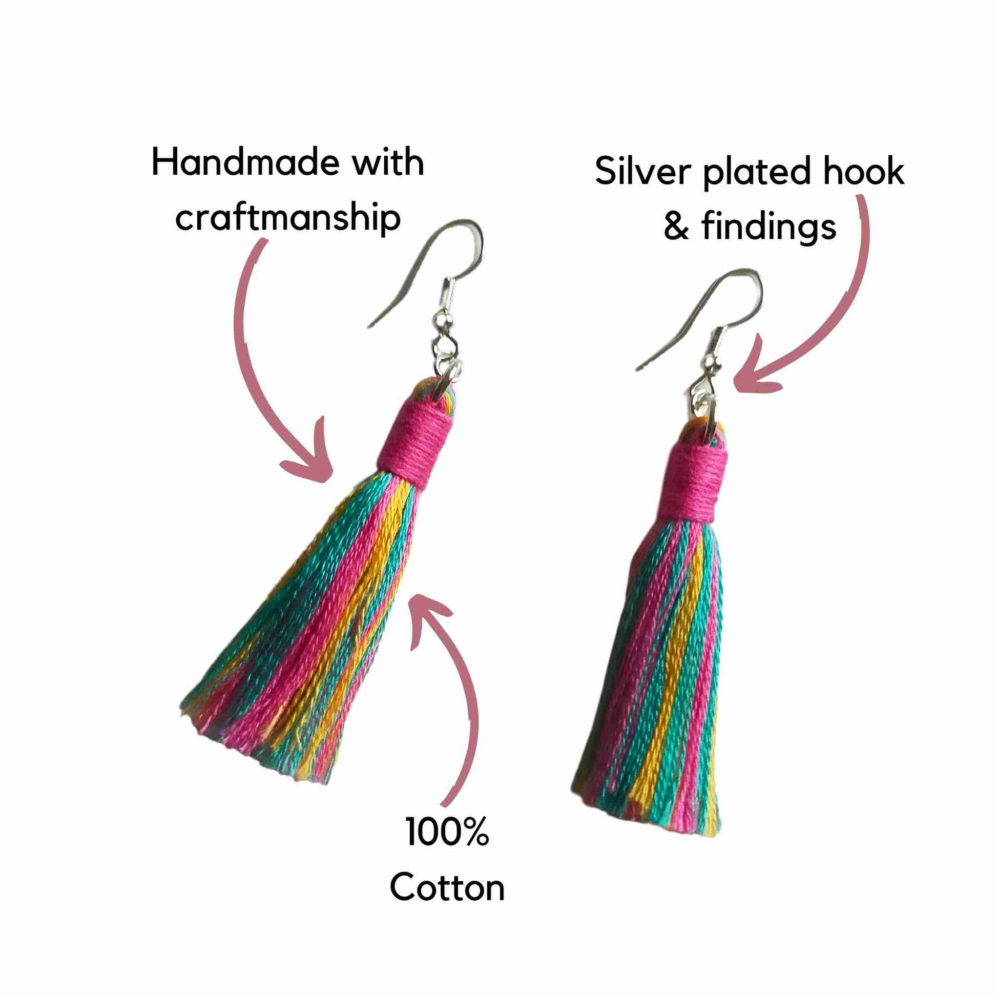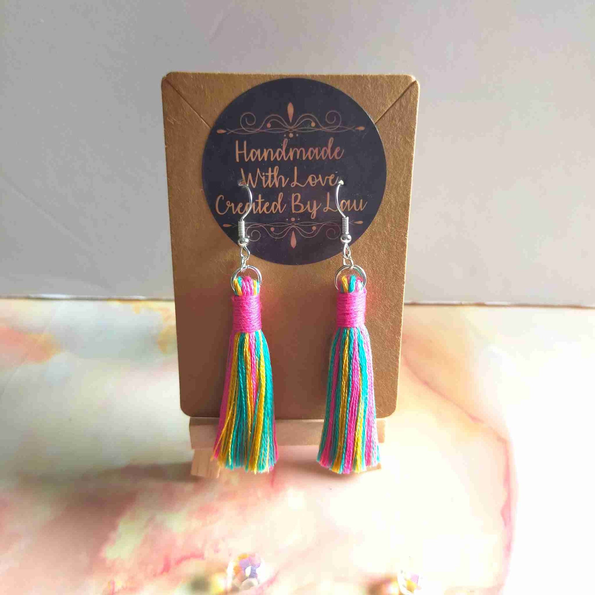 Our "Fallon Mini" 3 colours with contrast Tassel Earrings have been handmade with love. These earrings feature a beautiful combination of aqua, yellow and pink 100% cotton thread, and have been finished with silver plated findings and hooks. They're the perfect accessory for anyone who loves boho style. At Created By Lau, we believe that fashion should be fun, and these earrings are the perfect way to add a touch.