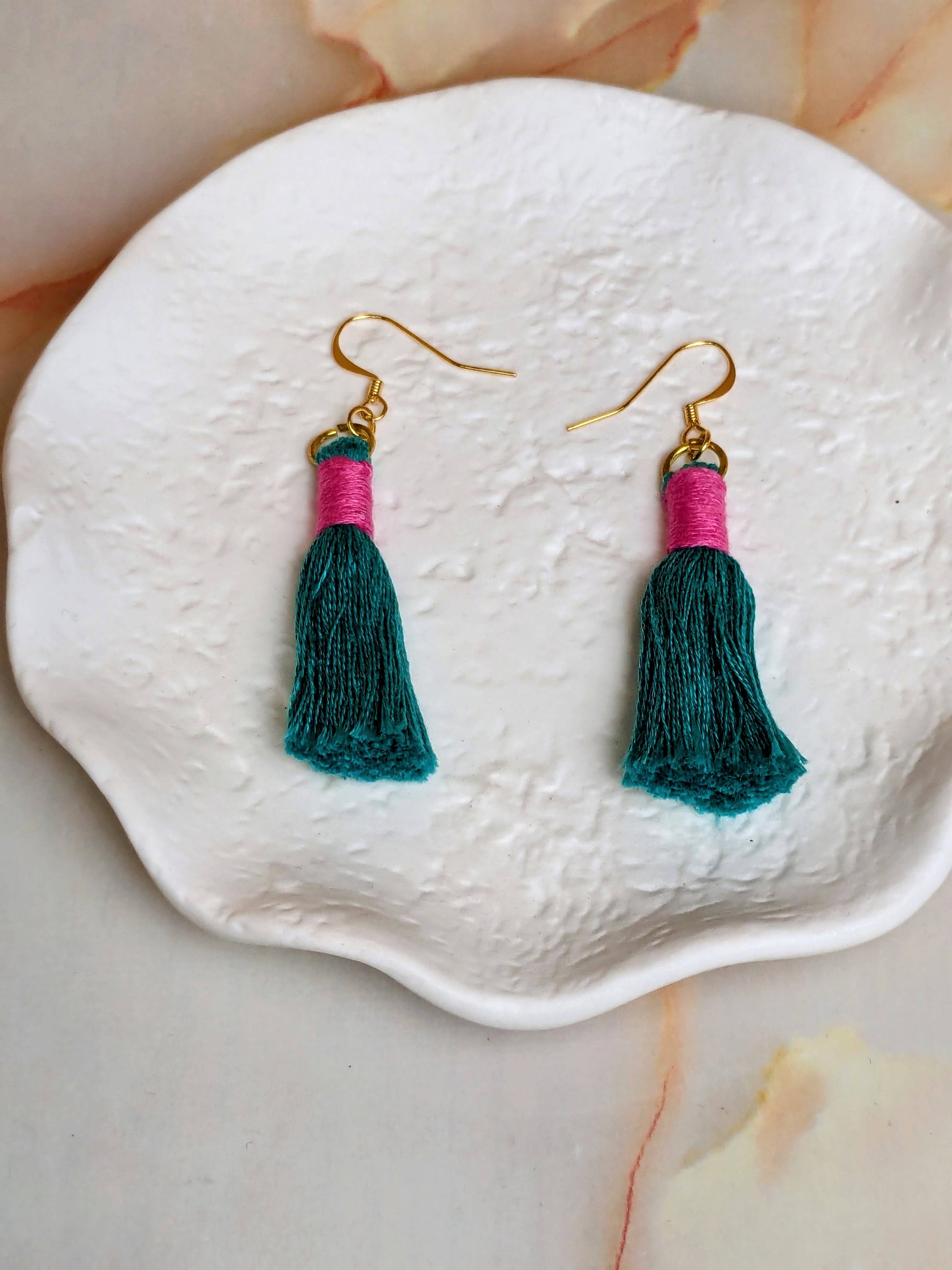Dress up any outfit with these tassel earrings! They're like a party on your ears, with vibrant aqua and pink tassels hanging from gold-plated hooks. Talk about making a statement! Whether you're headed to a festival or just want to add a pop of colour to your everyday look, these earrings have got you covered. Plus, the gold-plated hooks add a touch of elegance, making you feel like a true fashionista. Don't be surprised when people start asking where you got them - and trust us, you'll want to show them off. Get ready to turn heads with the Nova Mini Aqua & Pink 2 Colour Tassel Earrings!