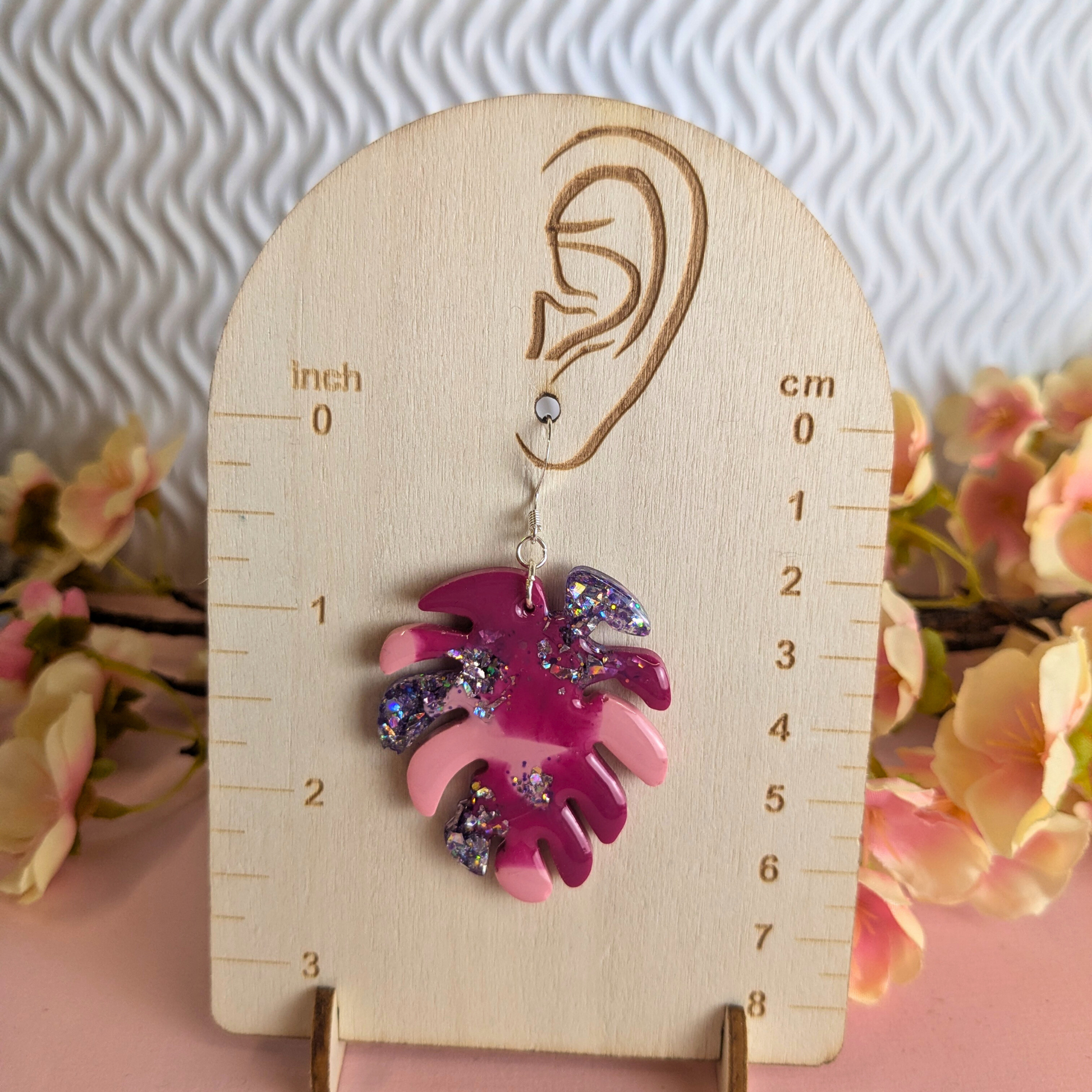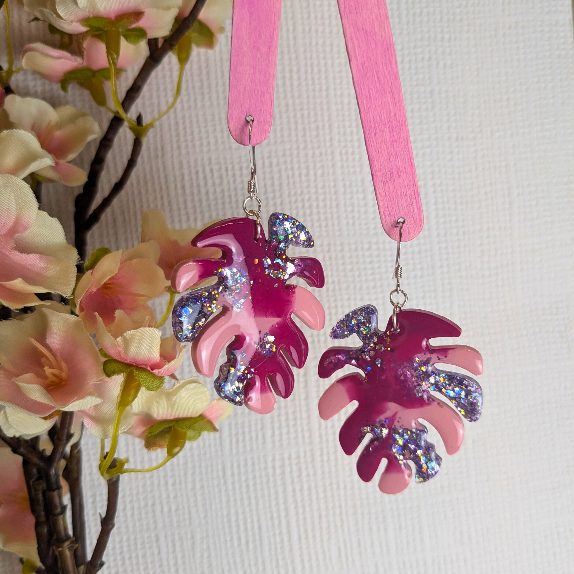 "Nyla" Pink Coloured with Lilac Glitter Leaf Earrings