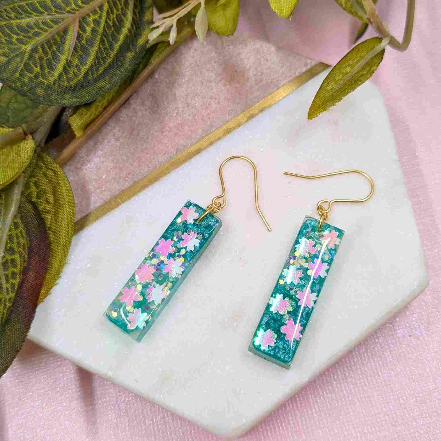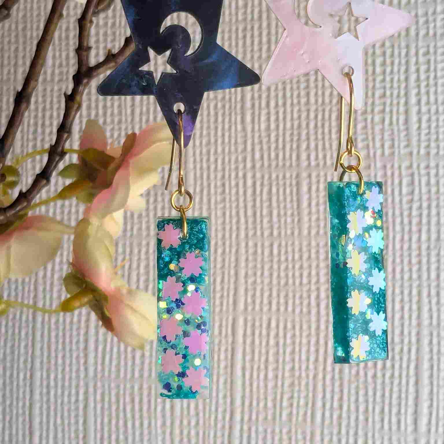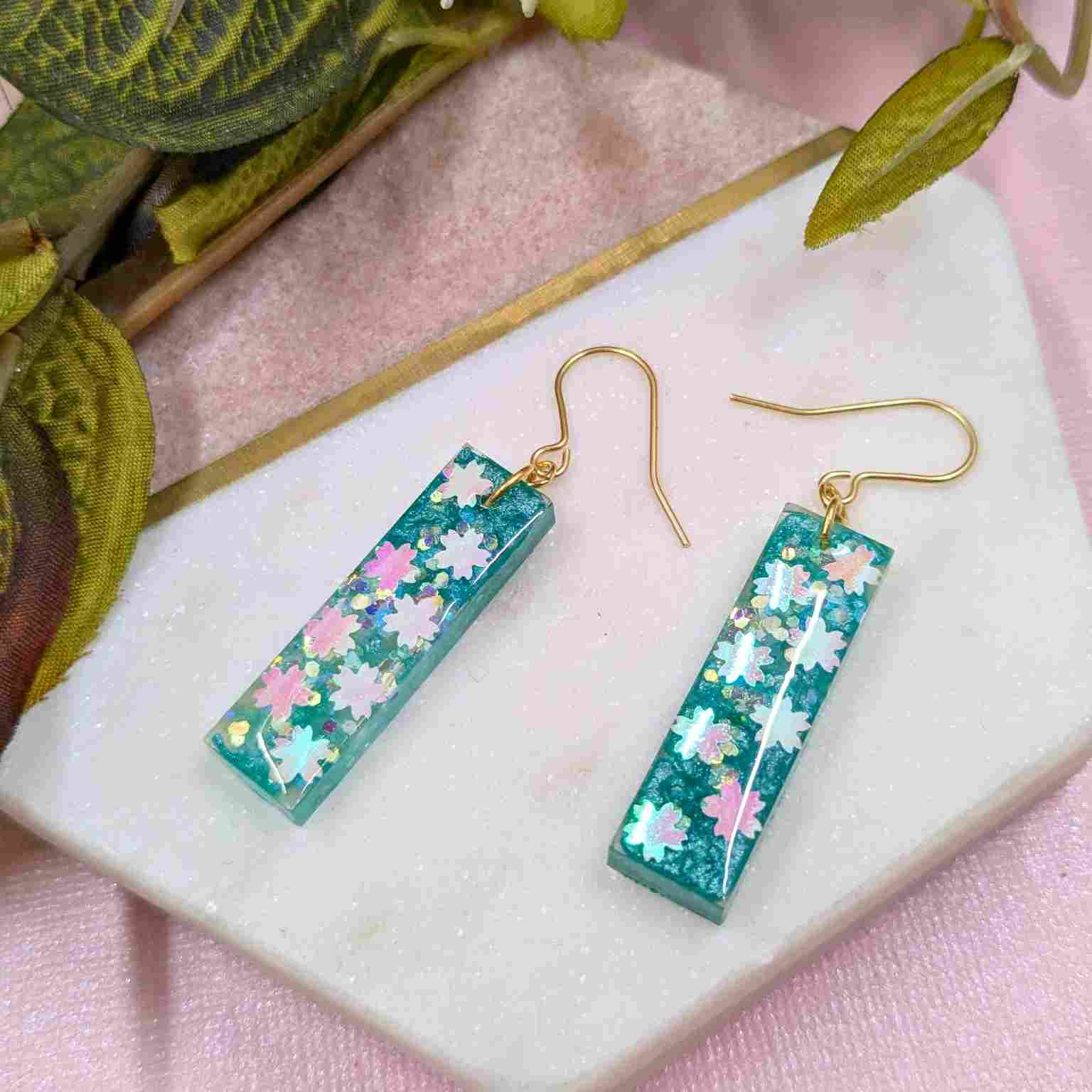 Add a touch of ethereal beauty to your style with our "Odette" earrings! Handmade with love in our Shipley studio, right here in West Yorkshire, these beauties combine a modern rectangle shape with delicate iridescent white flowers that shimmer with mica and dazzling glitter against a fresh aqua background.