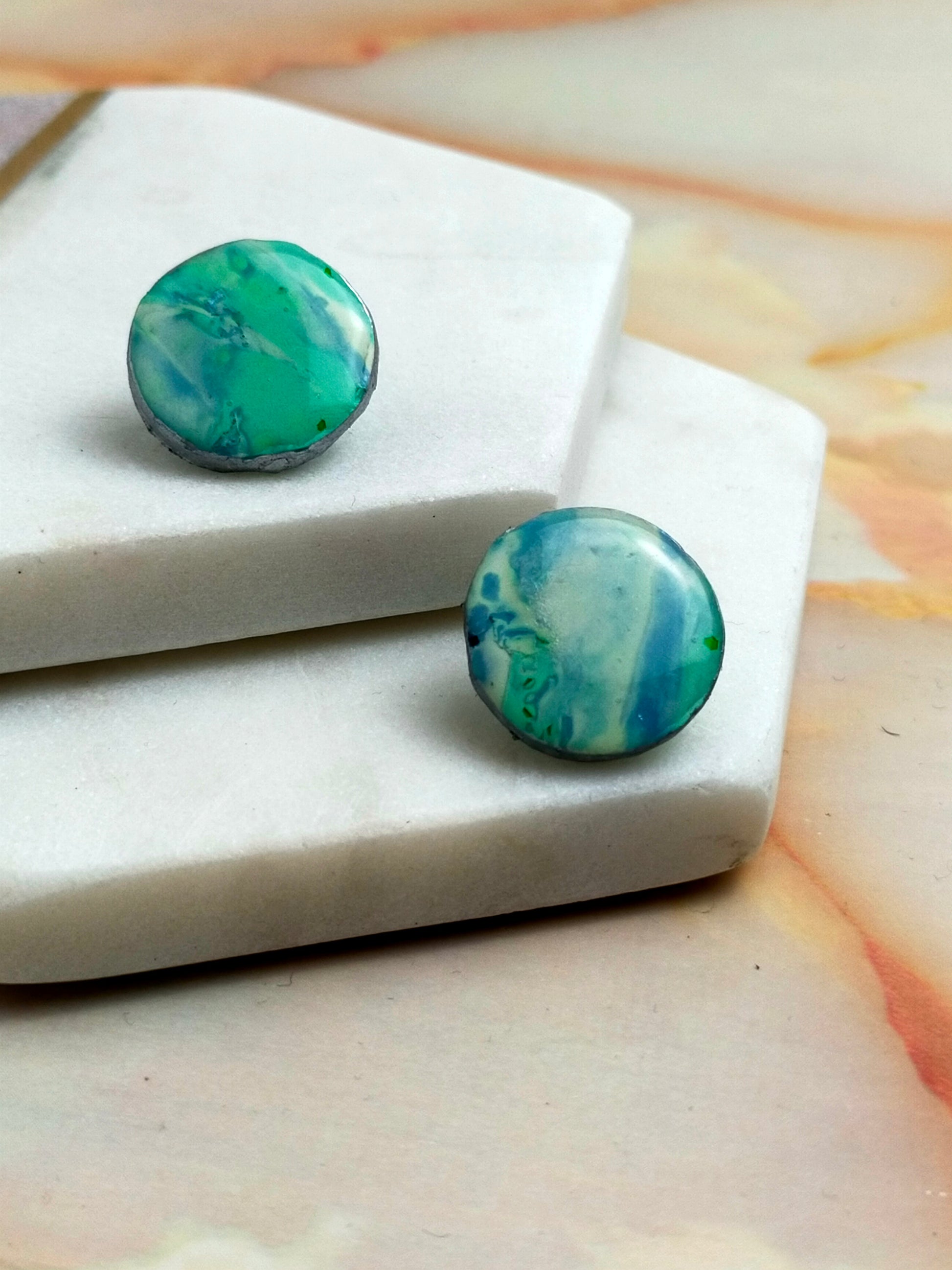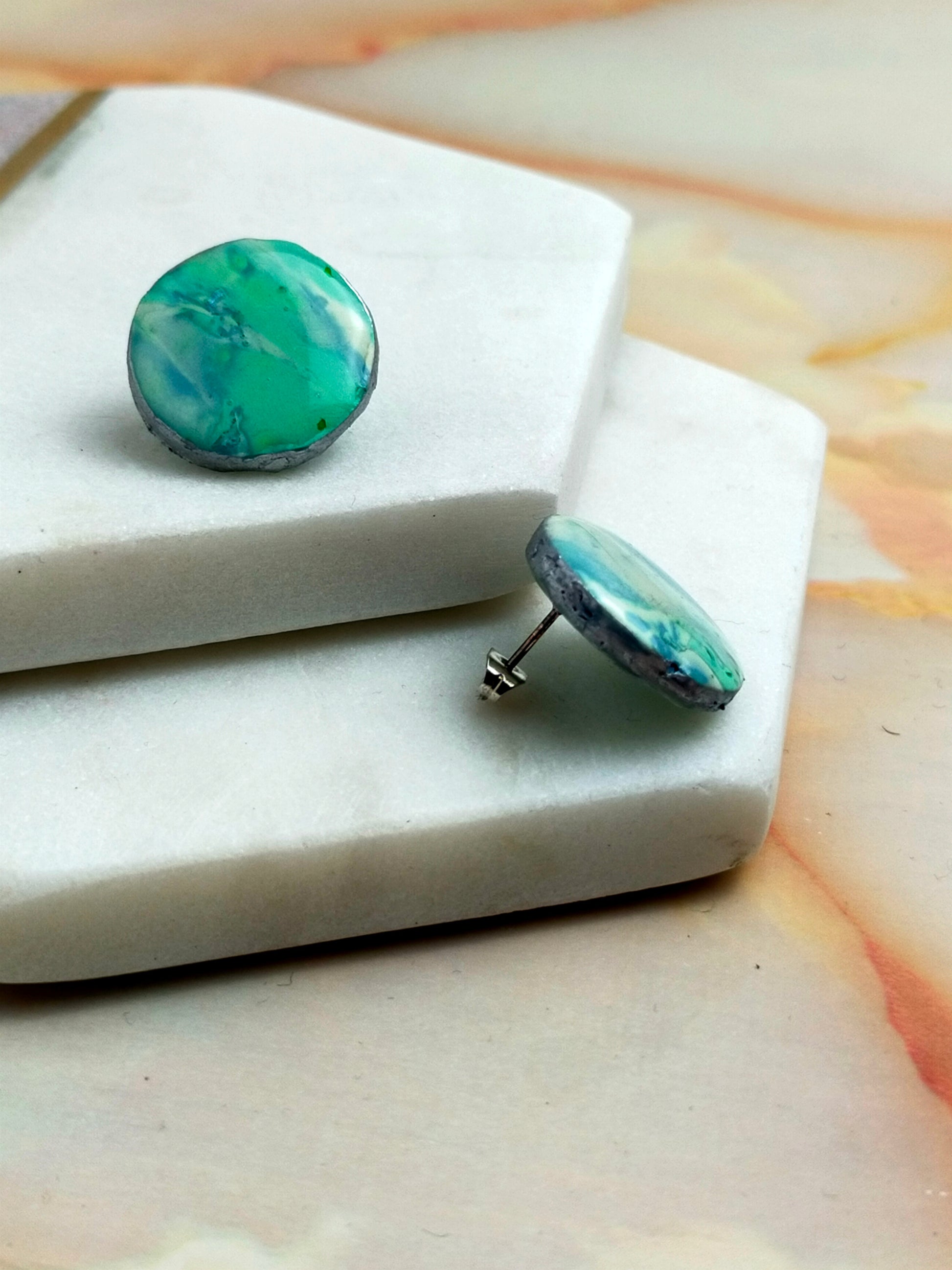 "Poppy" Green Blue Marble Circle Stud Earrings