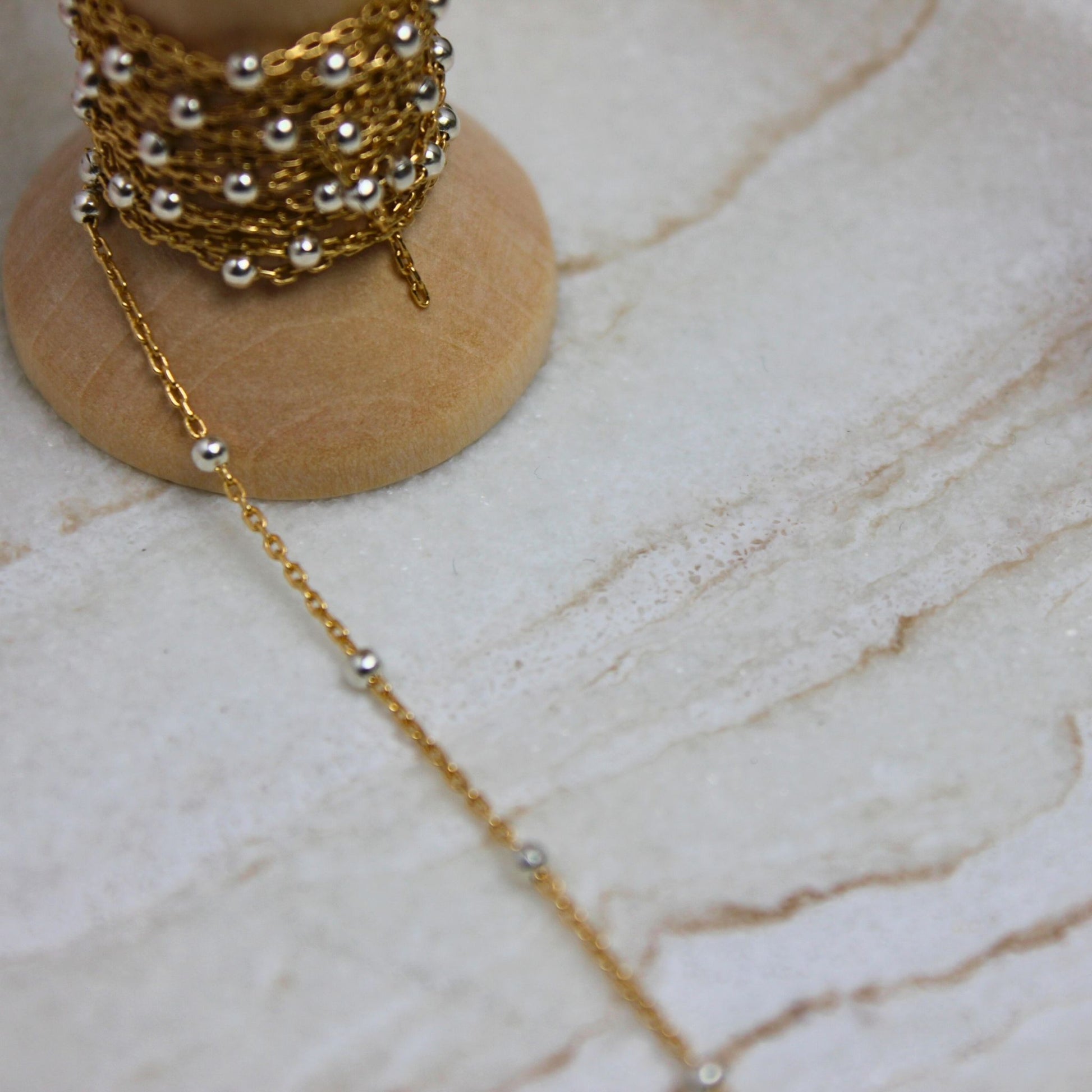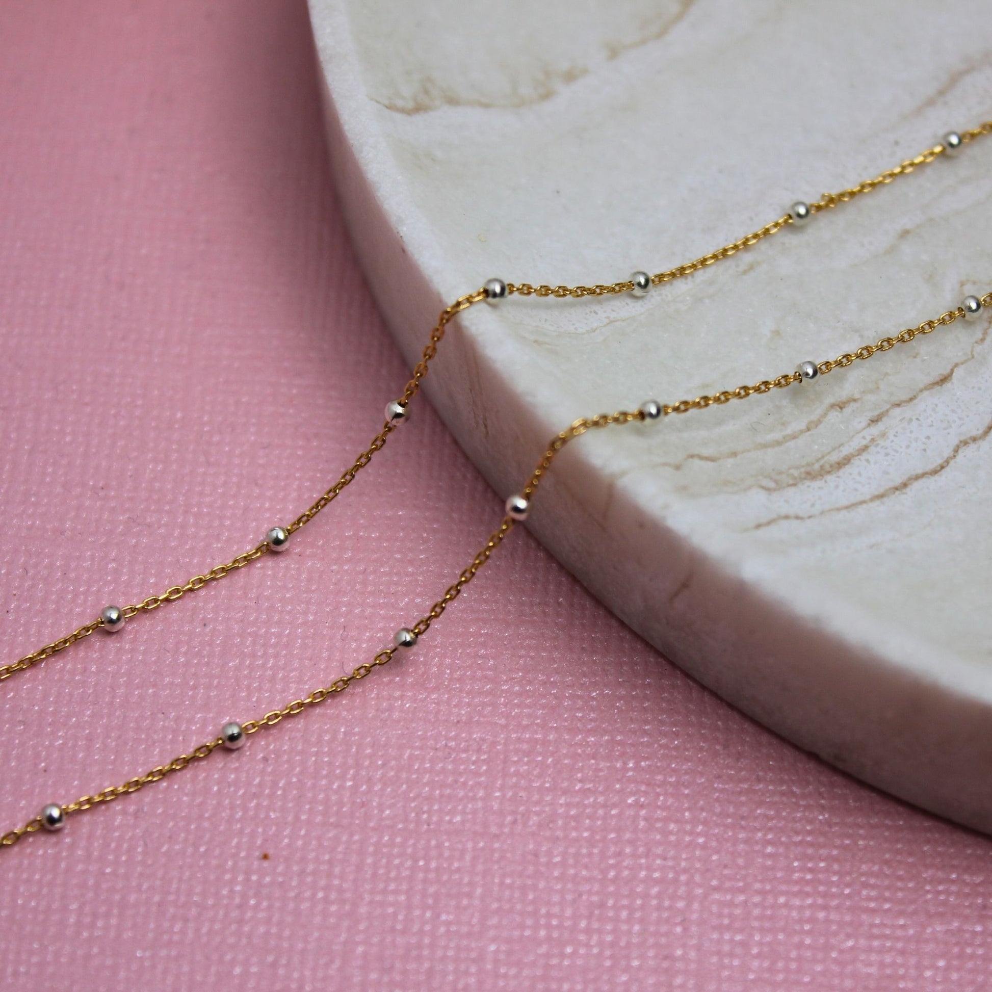 Indulge in a unique combination of luxury and style with the "Prague" Gold-Filled Satellite Chain with Silver Beads. This gold filled curb chain boasts sterling silver beads, adding a touch of elegance to any outfit. With 1.5mm x 1.2mm links and 2mm balls spaced 15mm apart, you'll stand out from the crowd.
