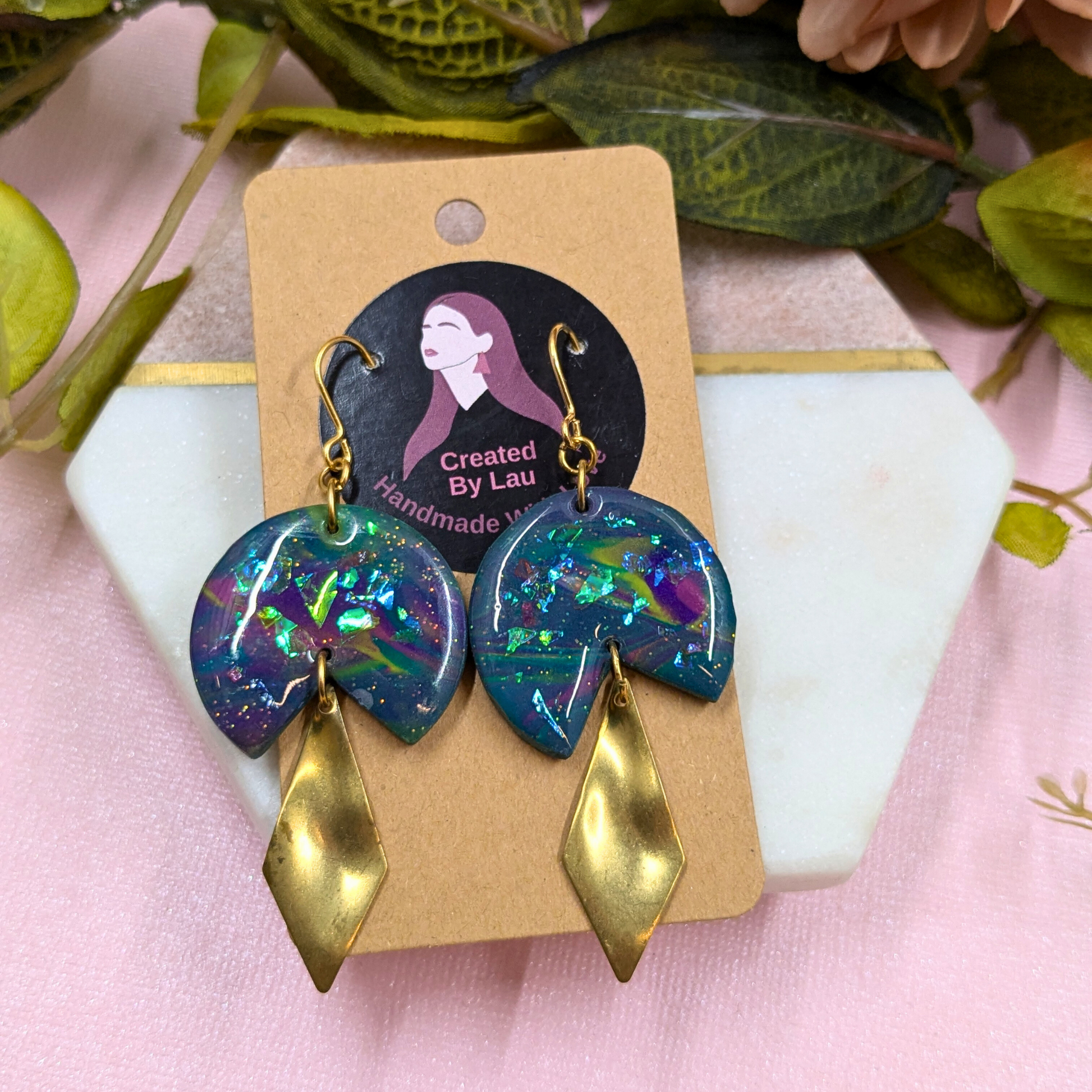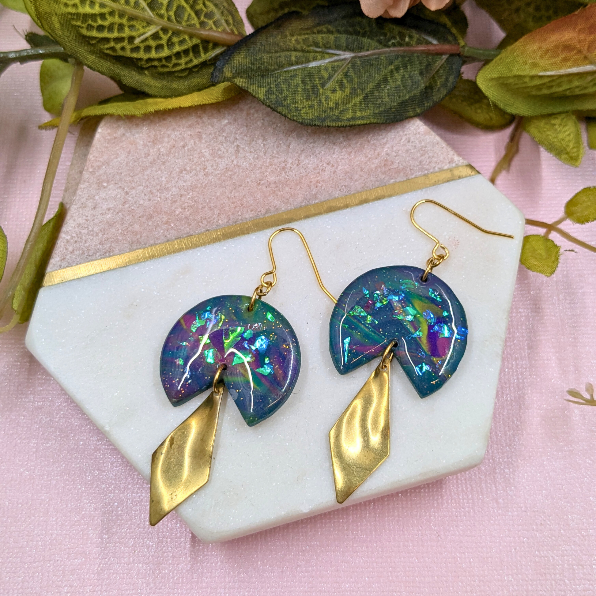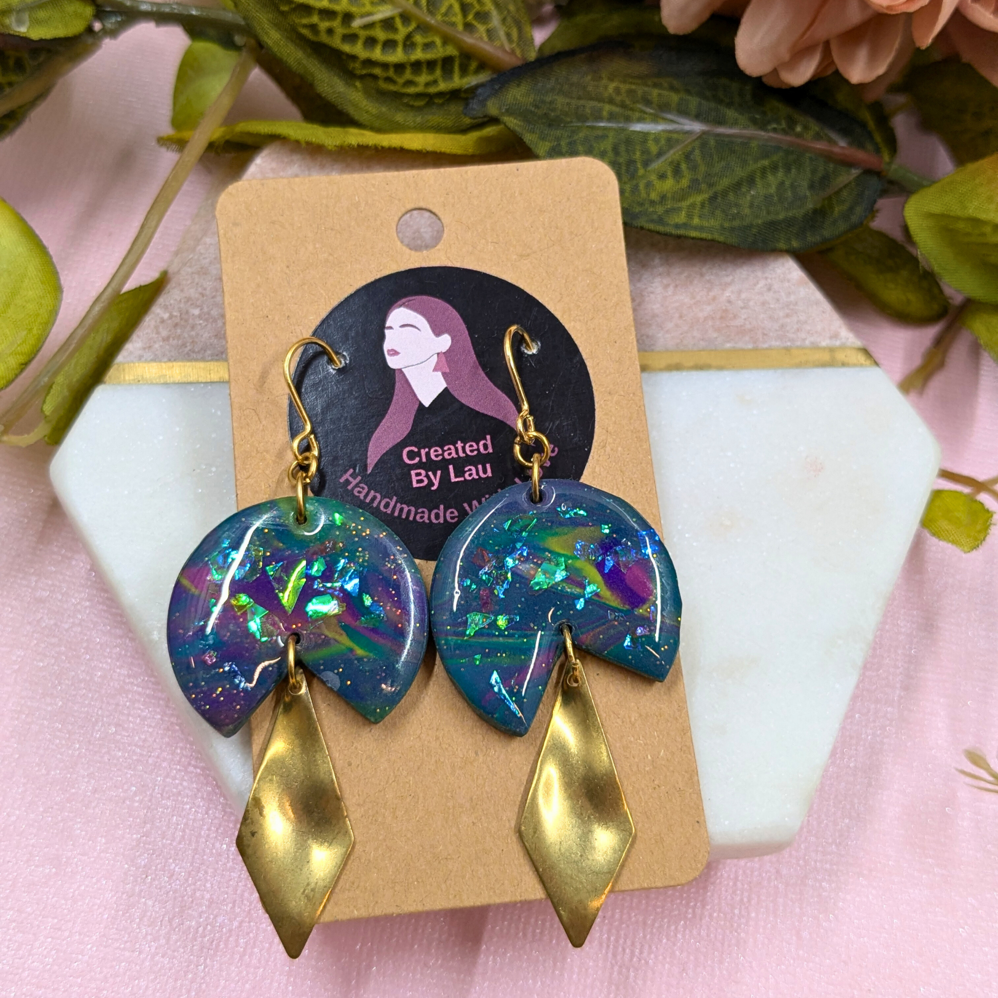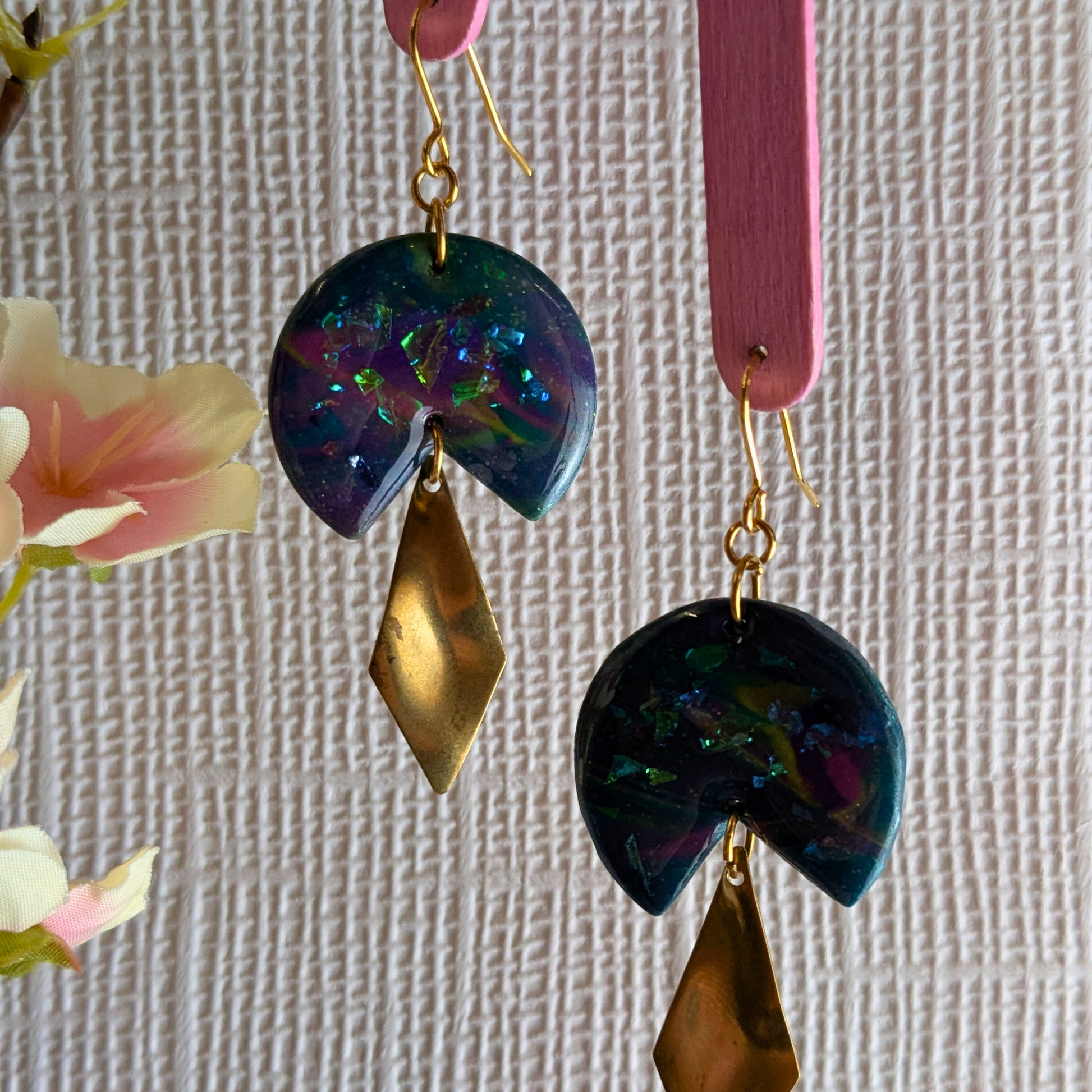 Each captivating piece is skillfully handmade from polymer clay, then elevated with mesmerising iridescent glitter captured in crystal-clear resin. This creates a magical marbling effect where blues, teals, greens, and purples subtly shift and shine with every movement. The unique circle shape with a pie cutout adds a modern, artistic touch, while a sleek, wavy diamond brass charm dangles gracefully below, giving them an effortlessly chic and contemporary flair.