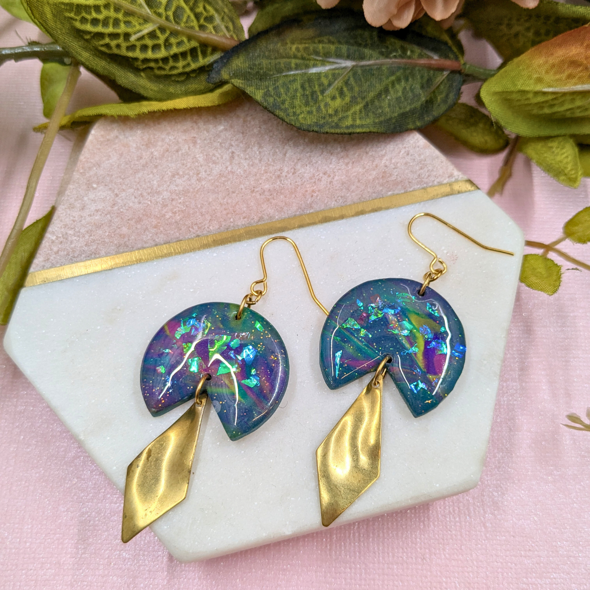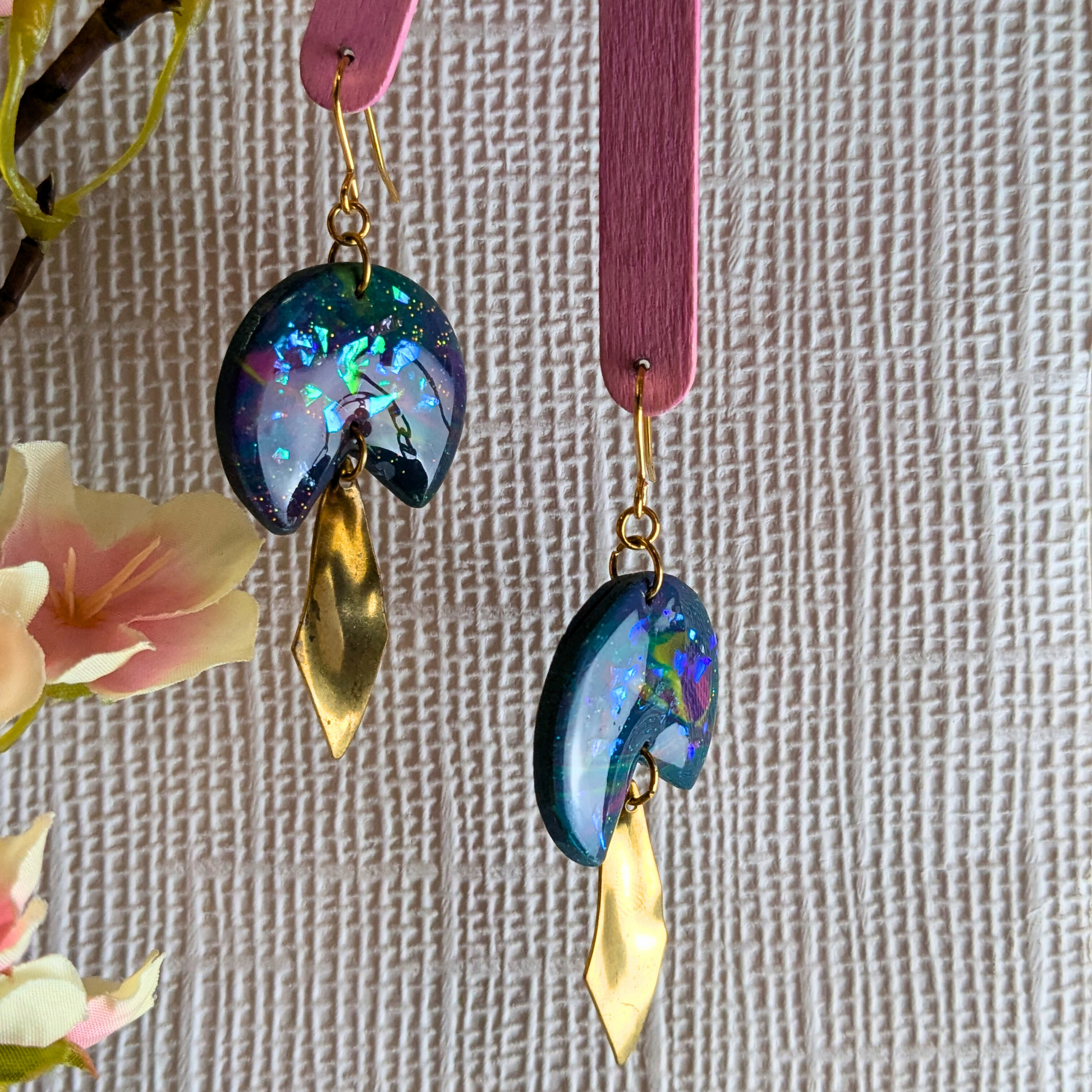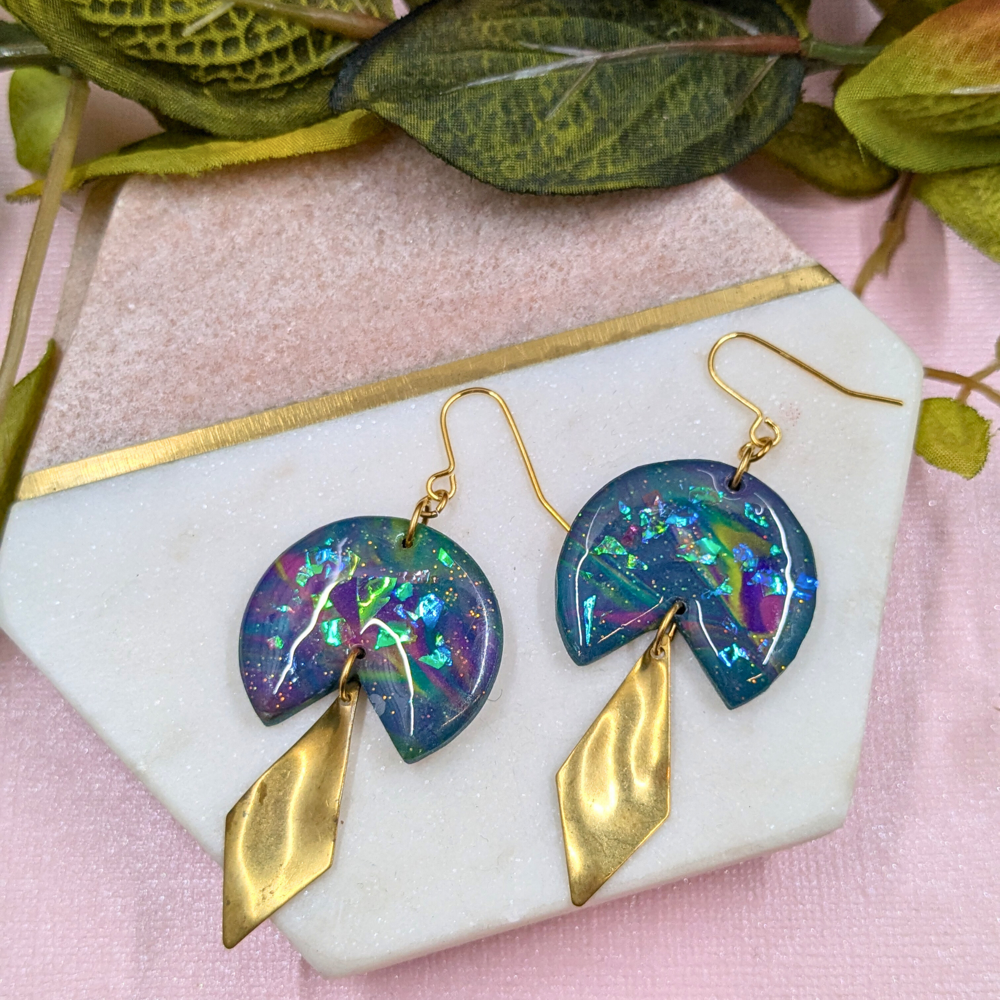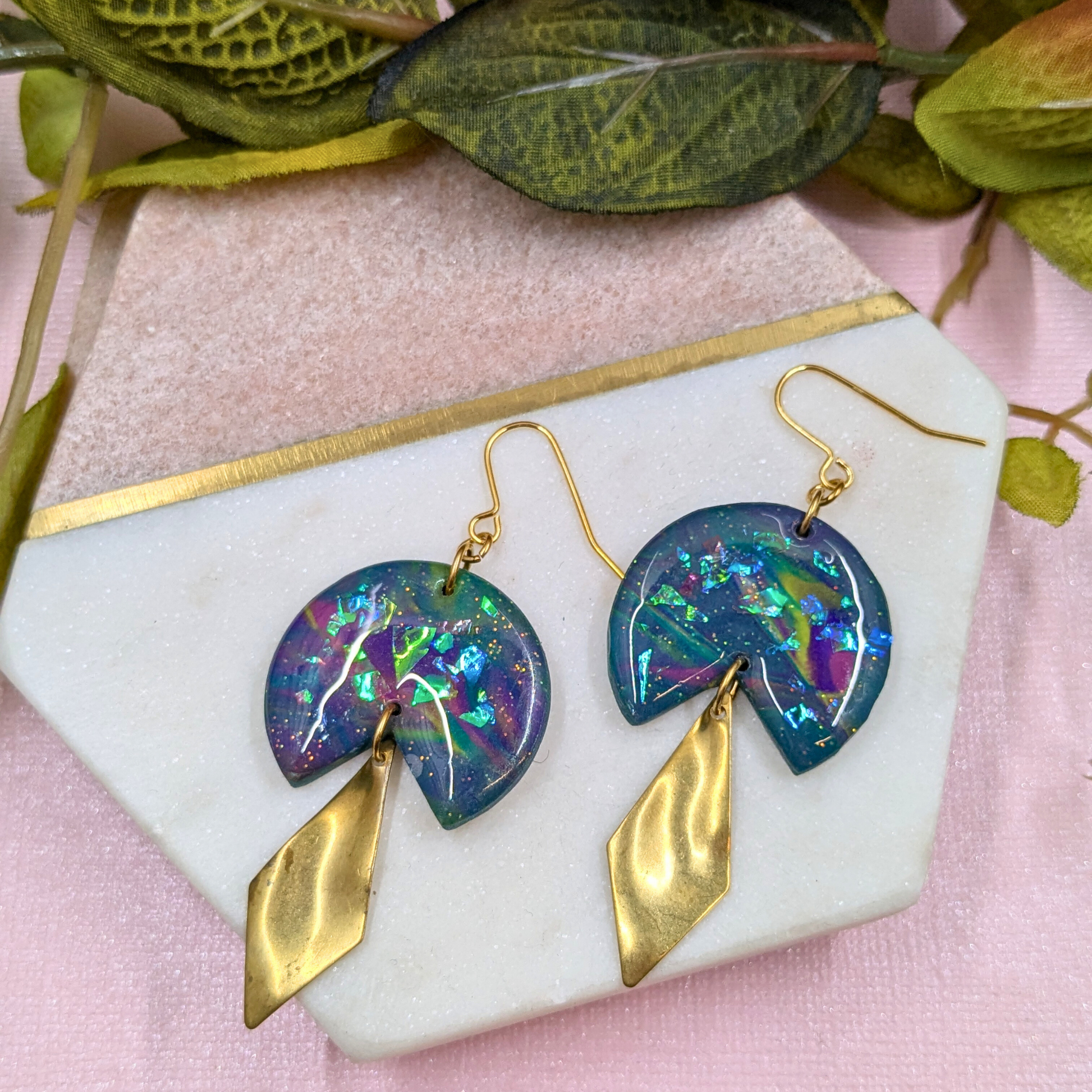 Each captivating piece is skillfully handmade from polymer clay, then elevated with mesmerising iridescent glitter captured in crystal-clear resin. This creates a magical marbling effect where blues, teals, greens, and purples subtly shift and shine with every movement. The unique circle shape with a pie cutout adds a modern, artistic touch, while a sleek, wavy diamond brass charm dangles gracefully below, giving them an effortlessly chic and contemporary flair.
