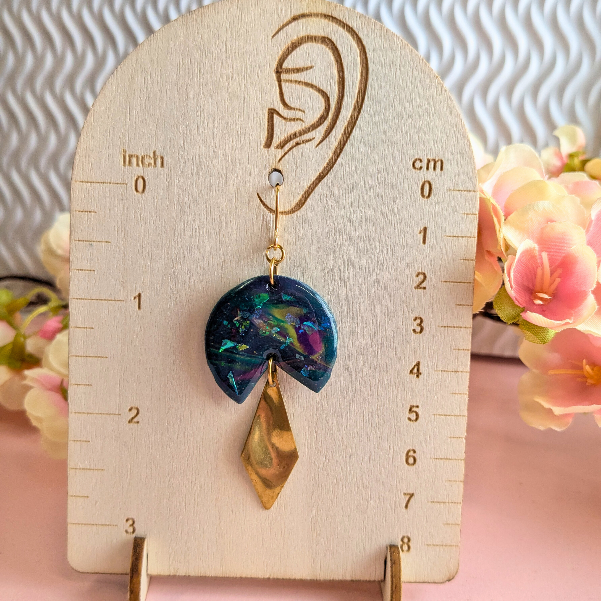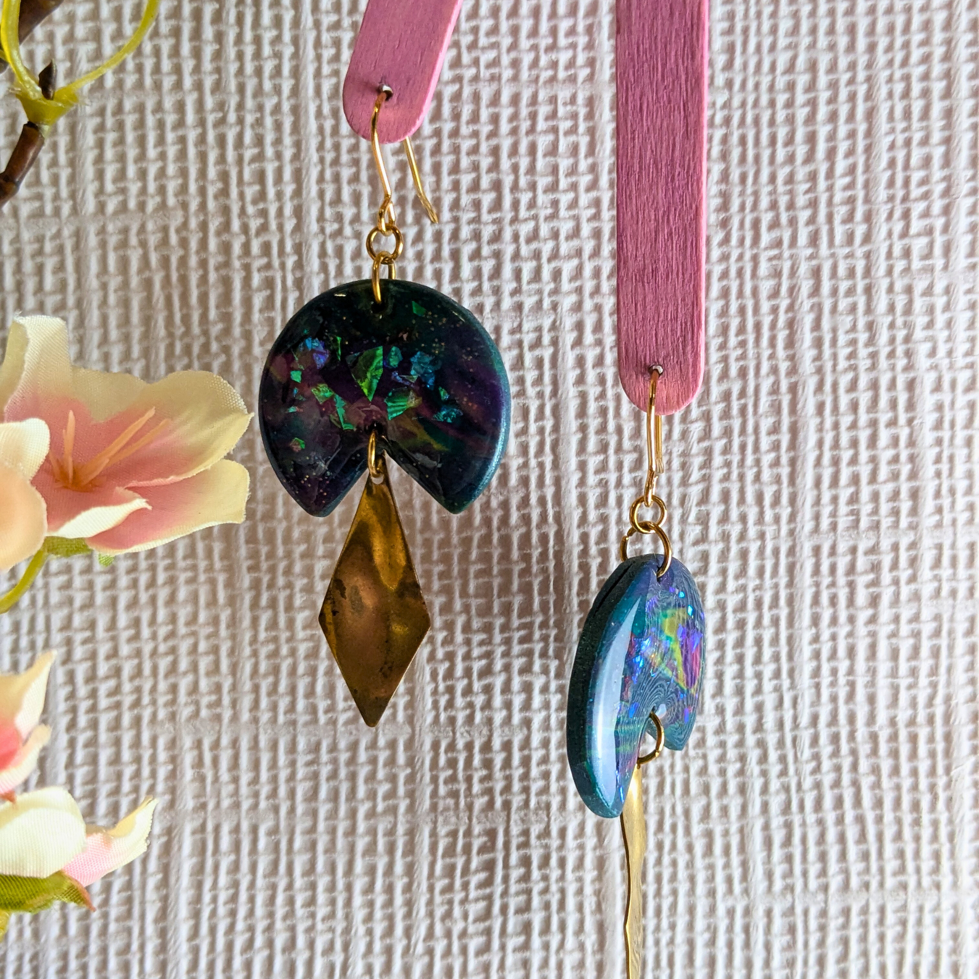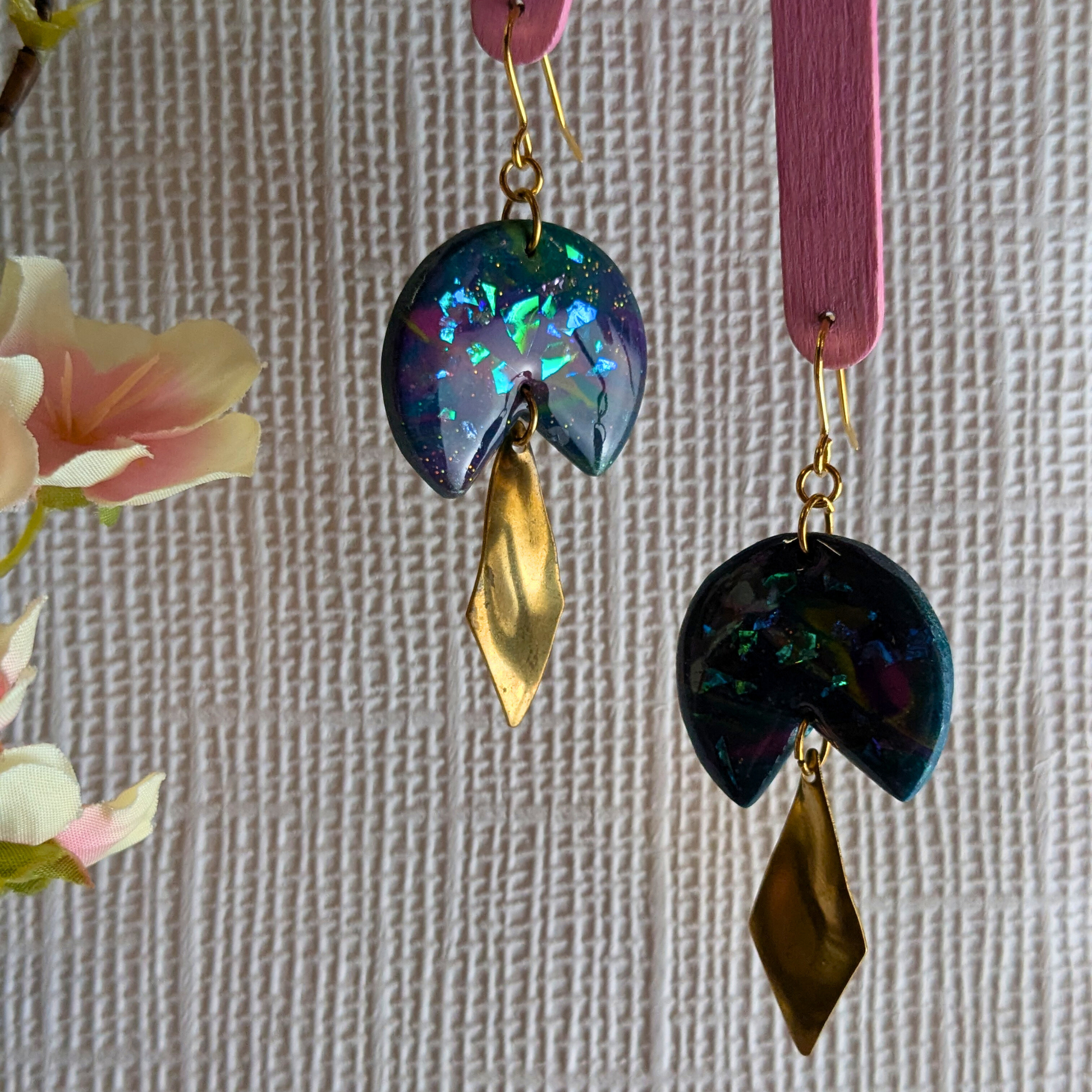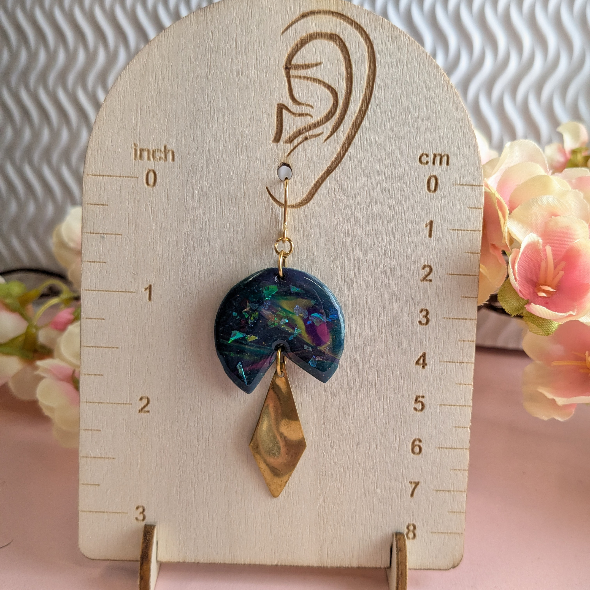 Each captivating piece is skillfully handmade from polymer clay, then elevated with mesmerising iridescent glitter captured in crystal-clear resin. This creates a magical marbling effect where blues, teals, greens, and purples subtly shift and shine with every movement. The unique circle shape with a pie cutout adds a modern, artistic touch, while a sleek, wavy diamond brass charm dangles gracefully below, giving them an effortlessly chic and contemporary flair.
