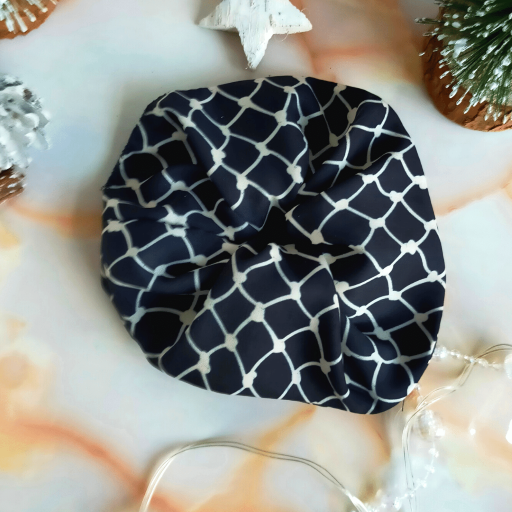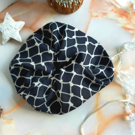 Elevate your hair game with the "Sage" Black & Cream Net Print Hair Scrunchie. Handmade with care, its delicate net print in classic black and cream adds a subtle yet stylish touch to any look. Perfectly sized at approximately 14cm diameter, it offers a comfortable hold without pulling. An ideal gift for Christmas, this scrunchie is a thoughtful stocking filler that friends and family will appreciate. Add a dash of charm to everyday hairstyles with this unique accessory.