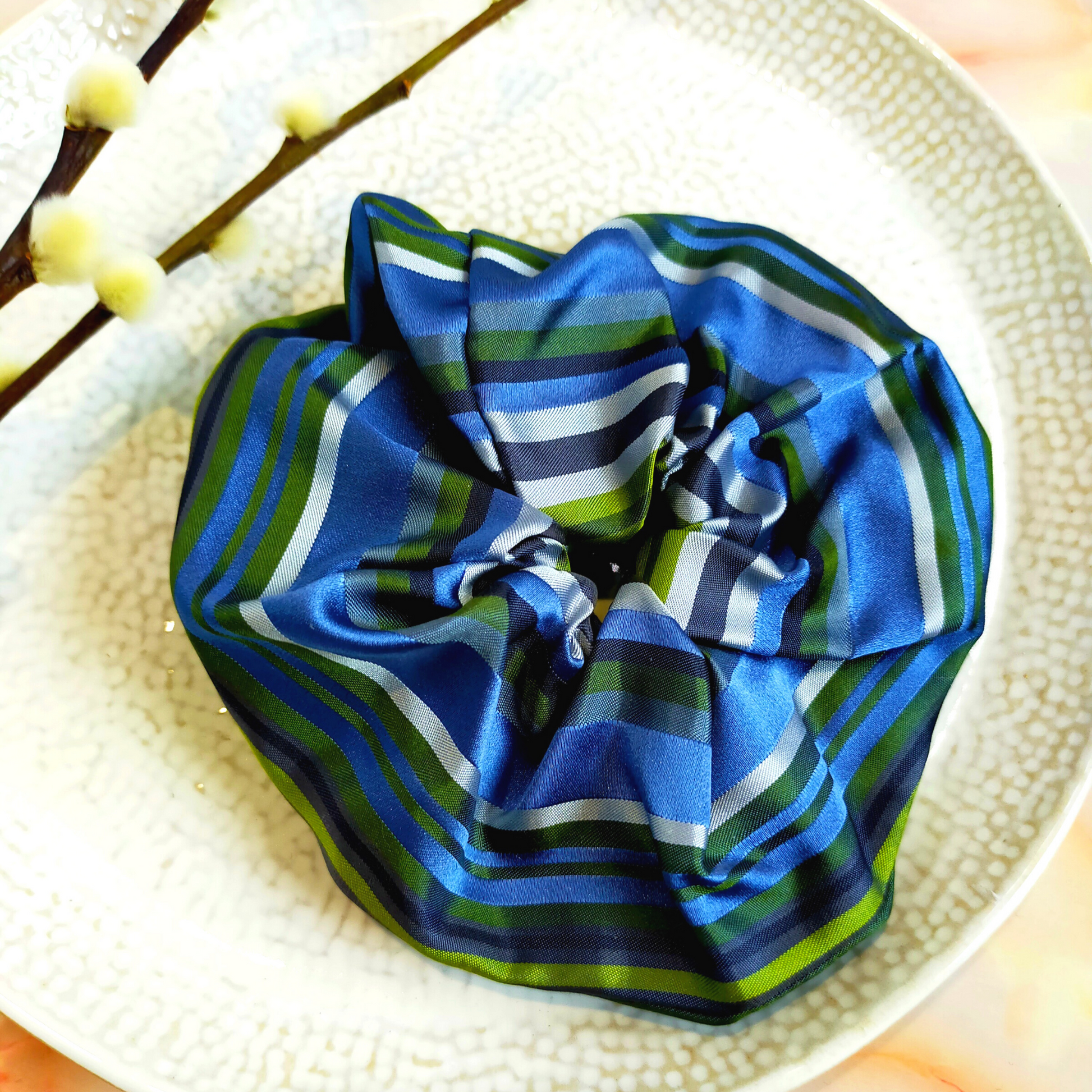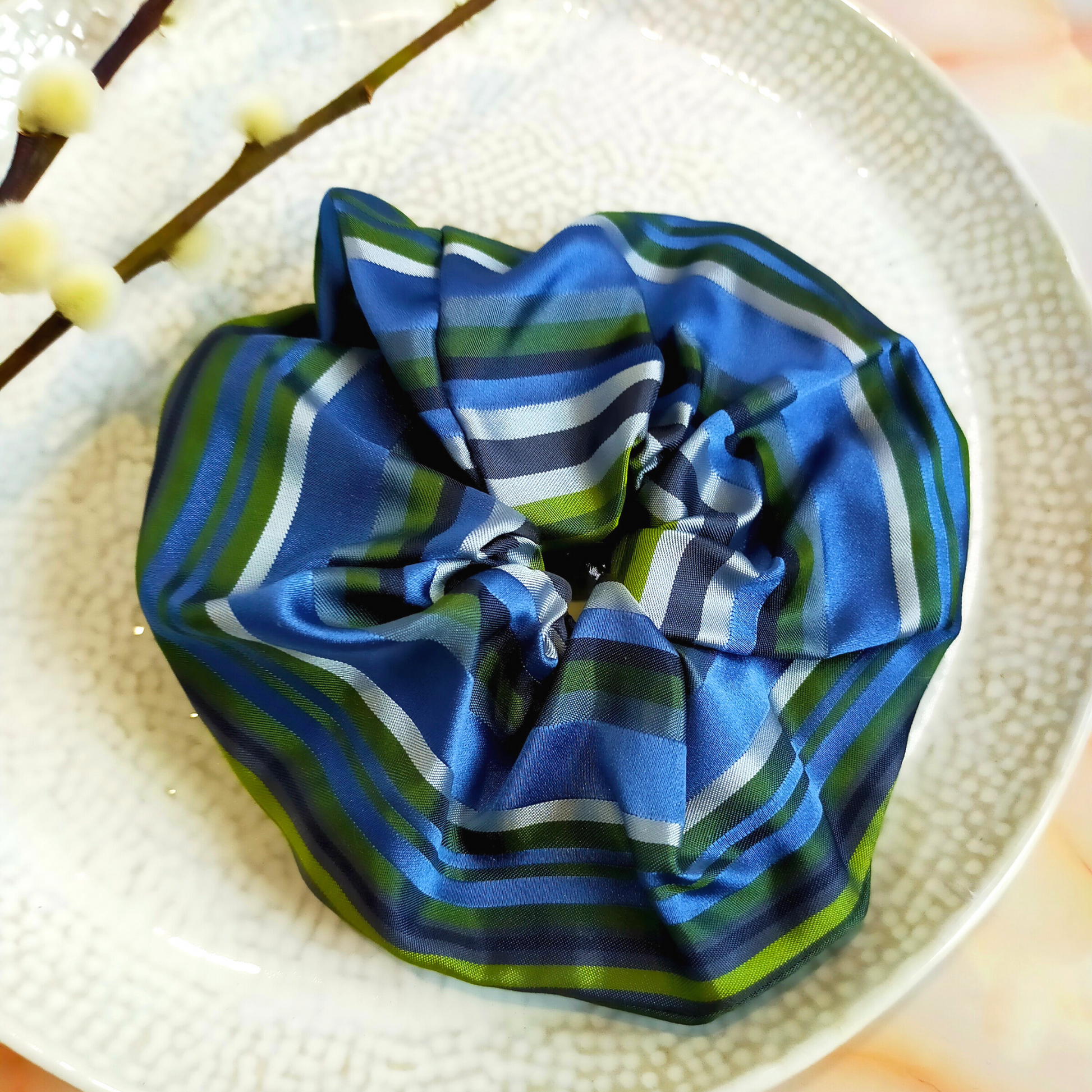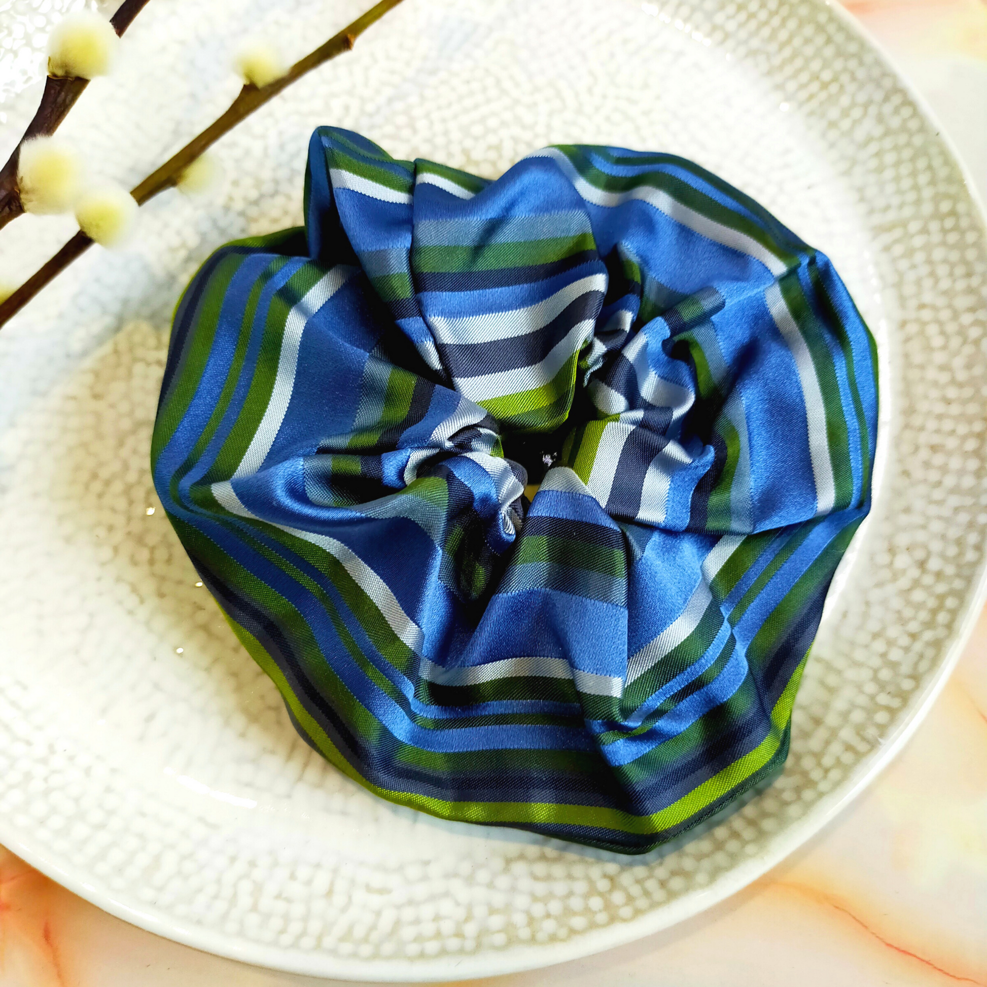 "Sage" Blue & Green Stripe Print Satin Hair Scrunchie