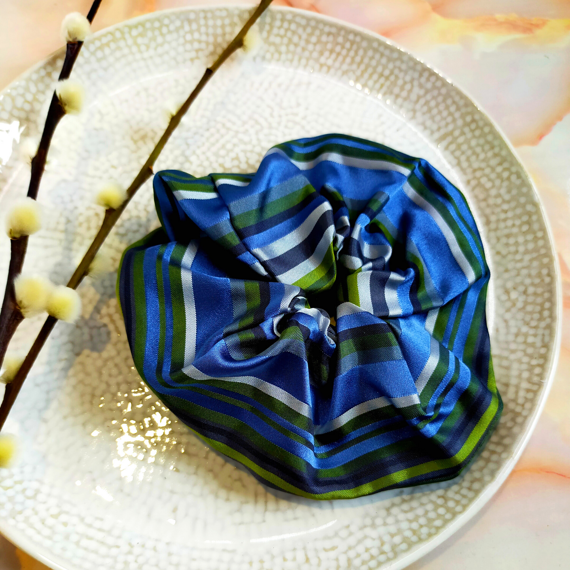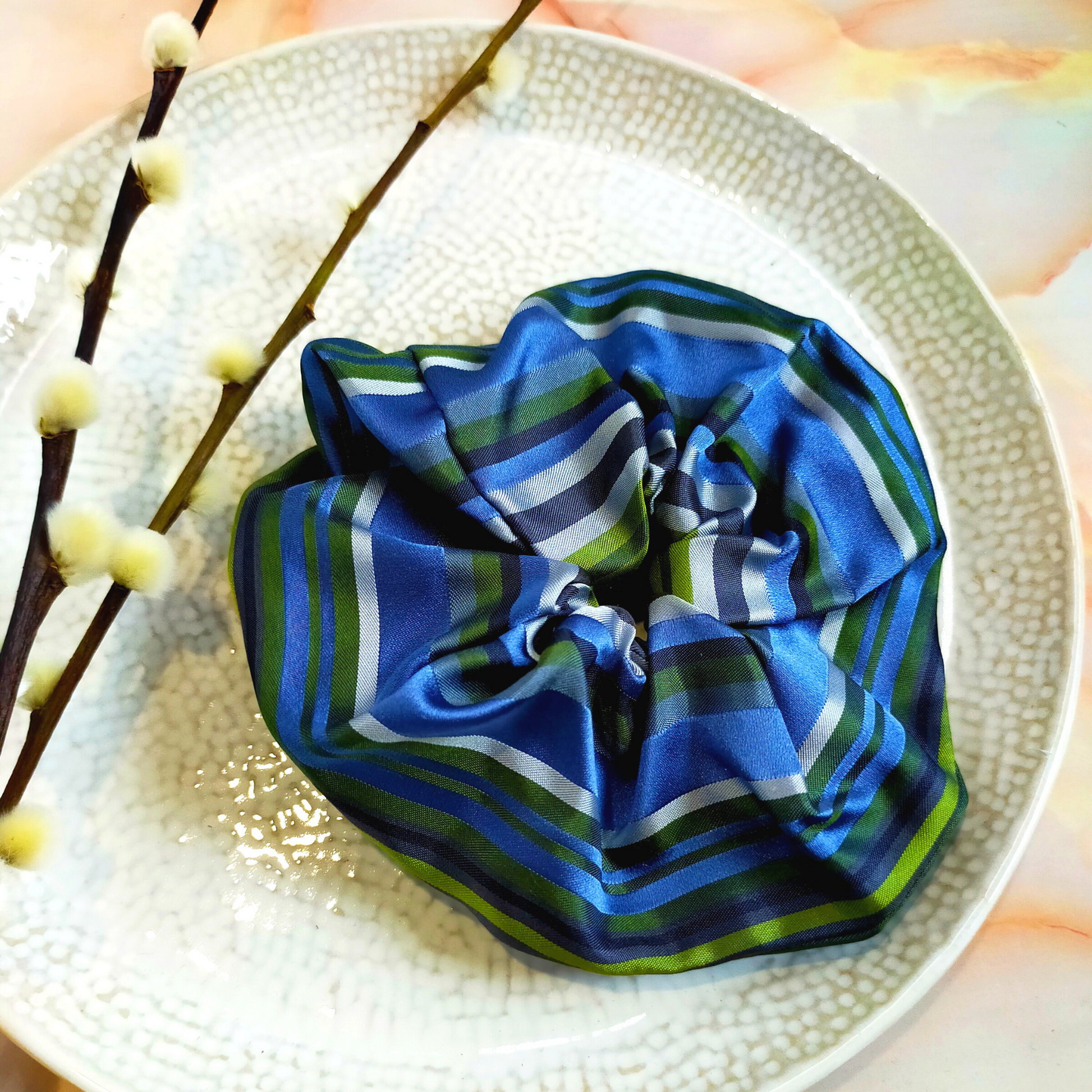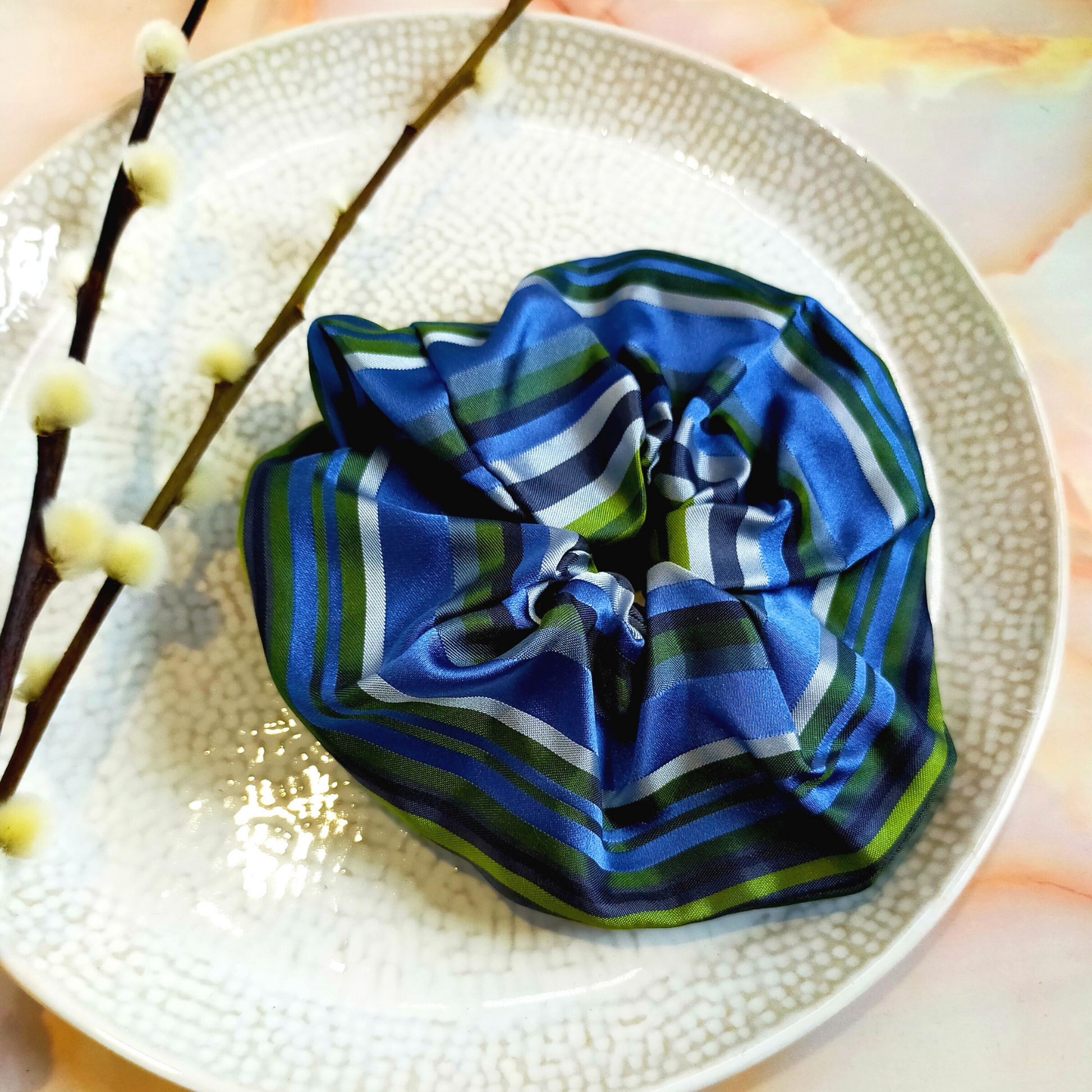 "Sage" Blue & Green Stripe Print Satin Hair Scrunchie