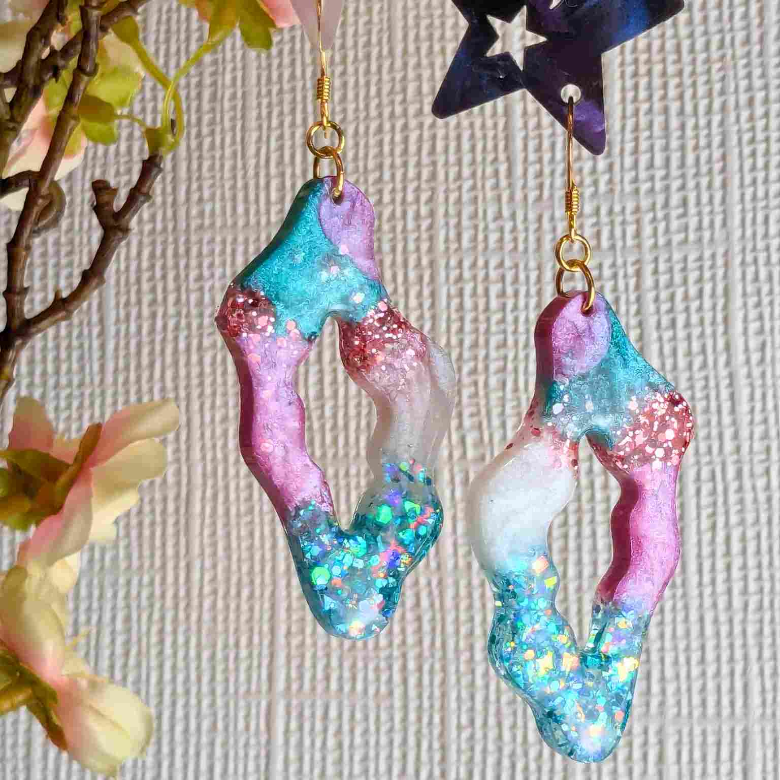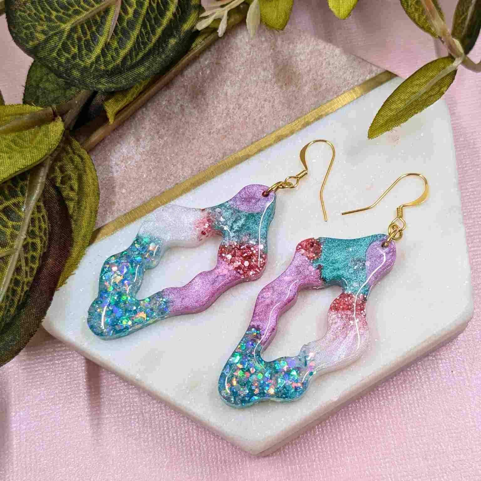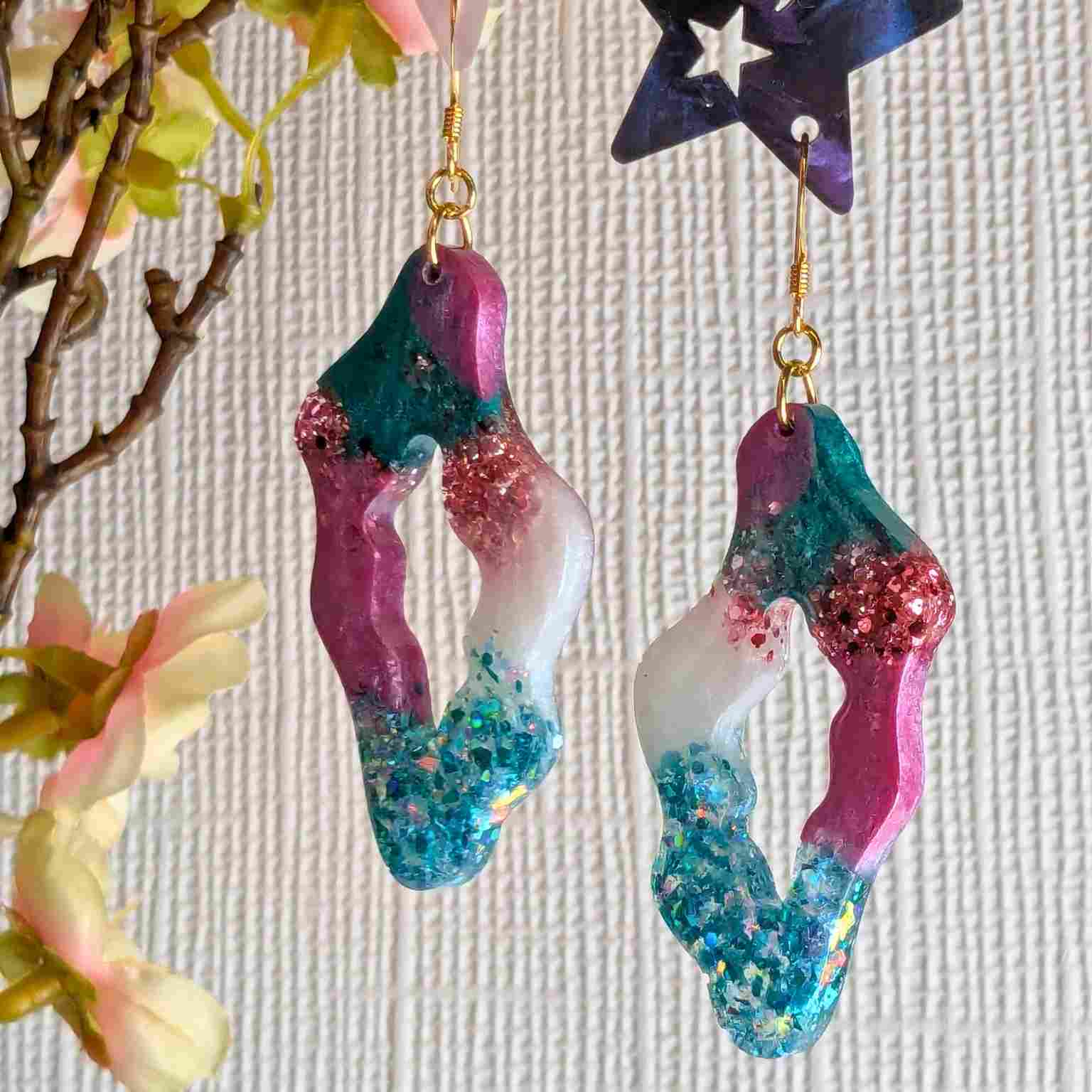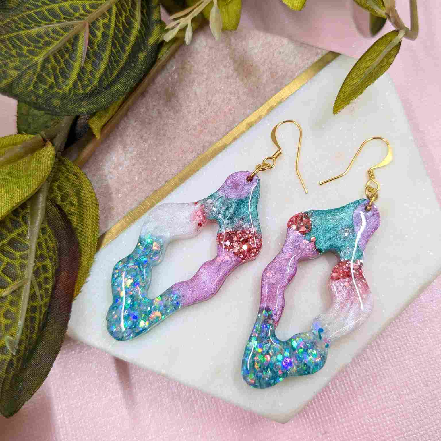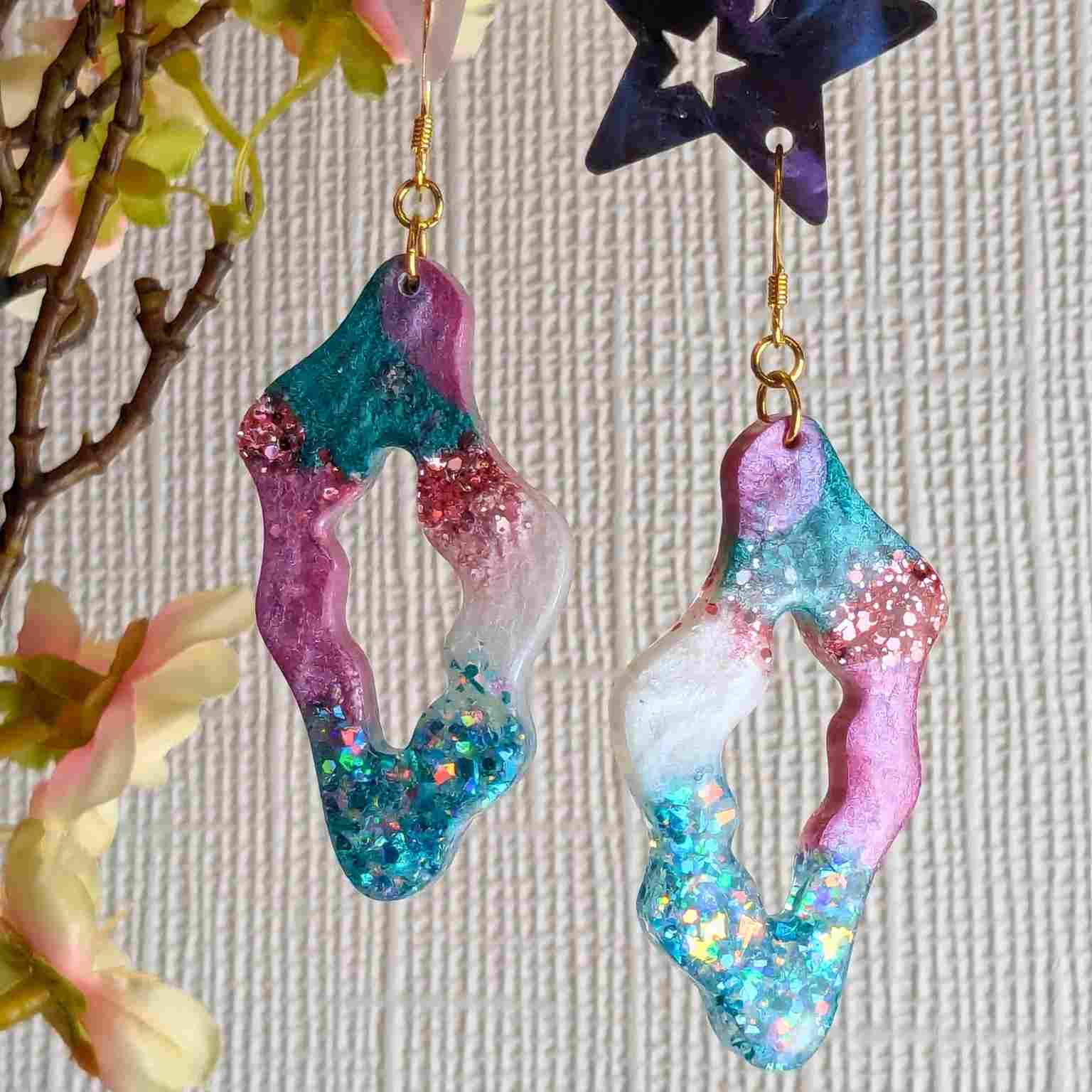Crafted from high-quality resin, the "Sana" earrings boast a modern wavy shape with intriguing cut-out detailing. The mix of vibrant pink and cool aqua, enhanced with the subtle shimmer of mica and the bold sparkle of glitter, creates a truly eye-catching effect. Finished with elegant gold-plated hooks, these earrings have a stylish 7.5 cm drop that will sway beautifully and add a touch of artistic flair to any outfit.