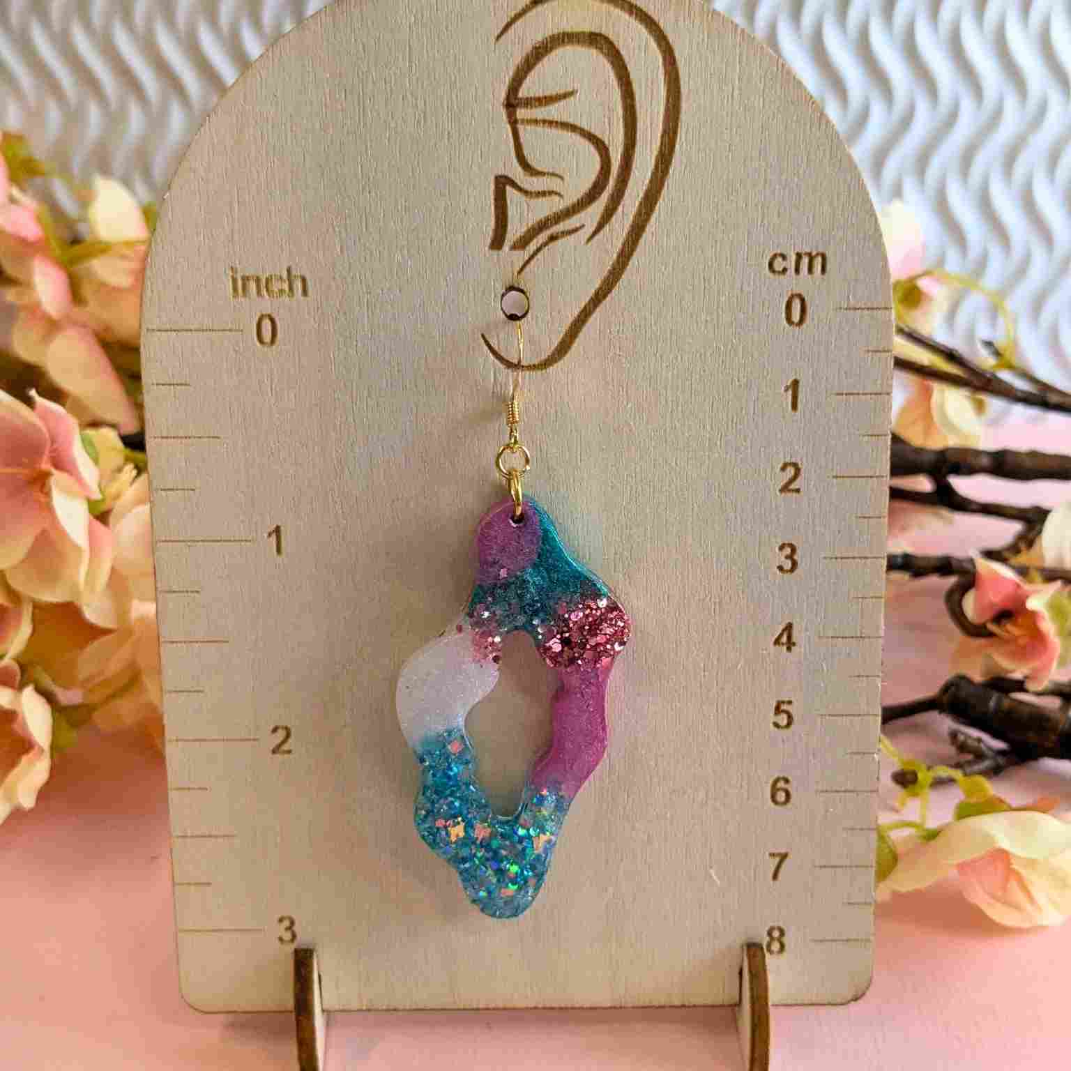 Make a stylish statement with our "Sana" wavy cut-out dangle earrings! Handmade with love in our Shipley studio, right here in West Yorkshire, these earrings feature a unique abstract design with a captivating blend of aqua, pink, and white, all infused with shimmering mica and dazzling glitter.