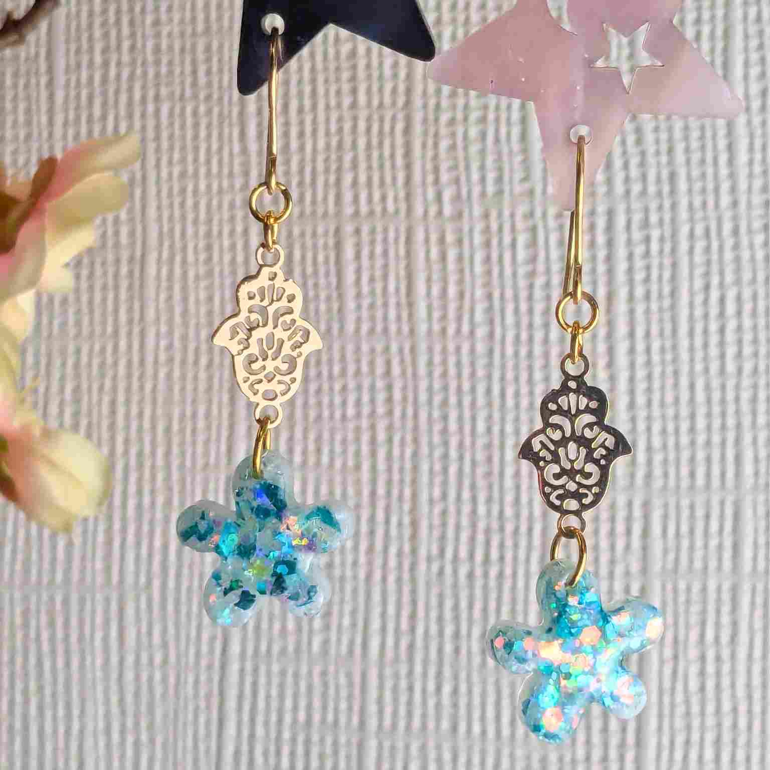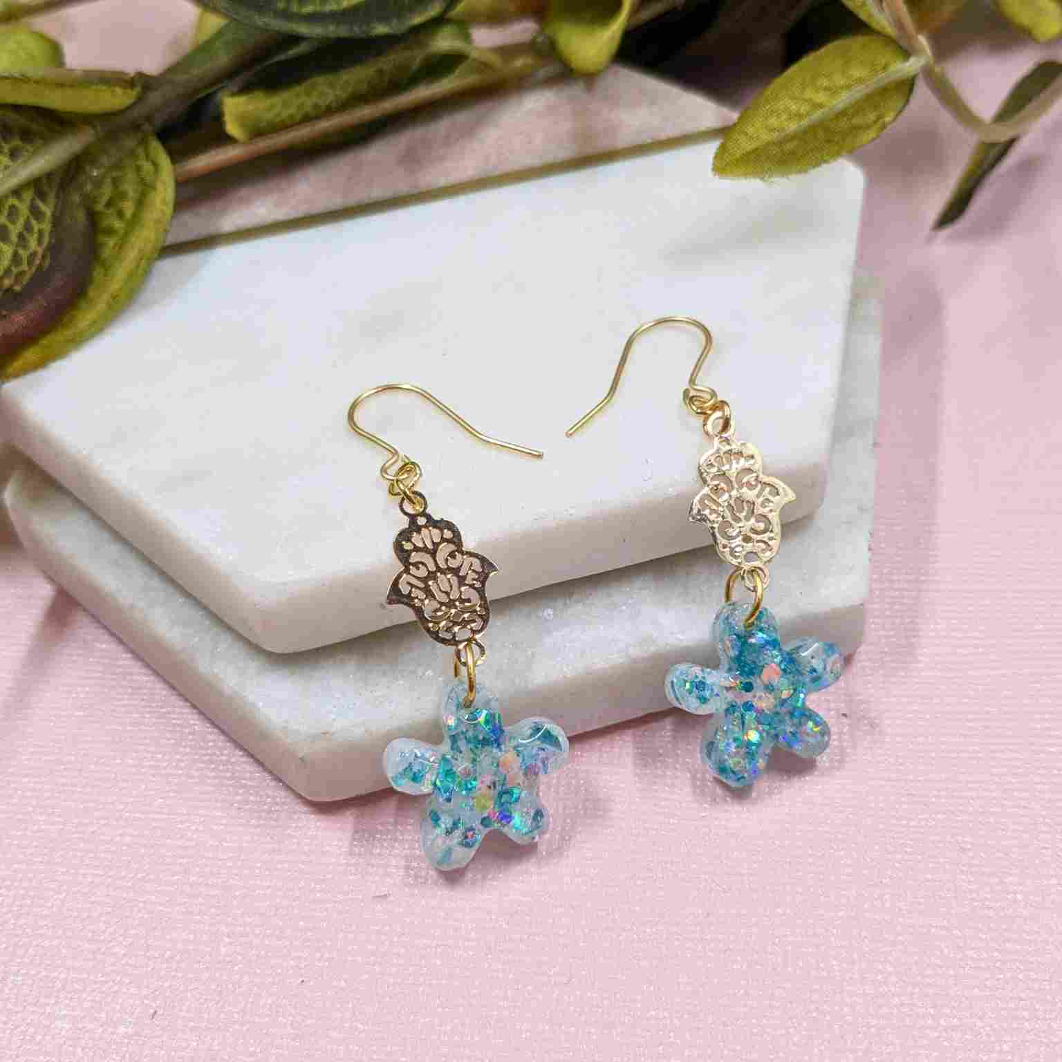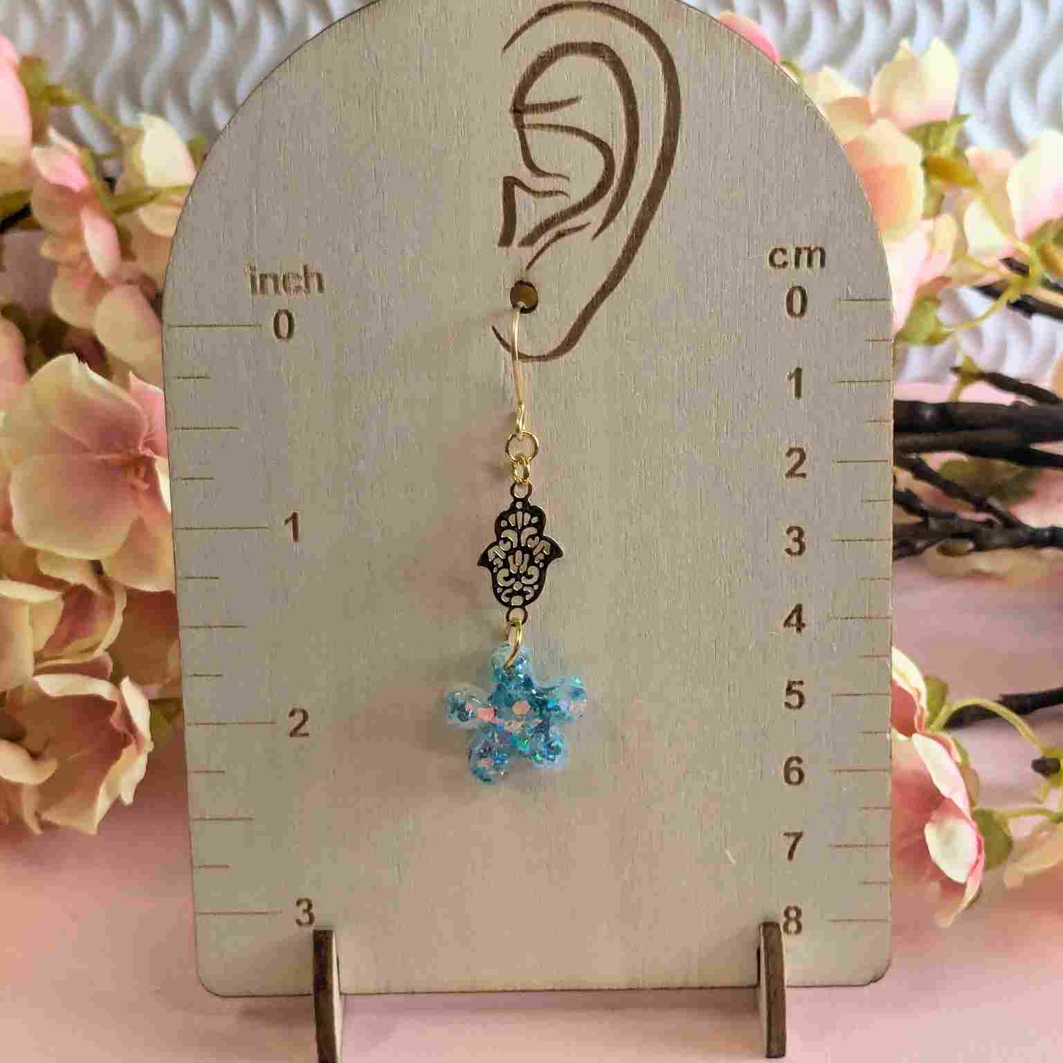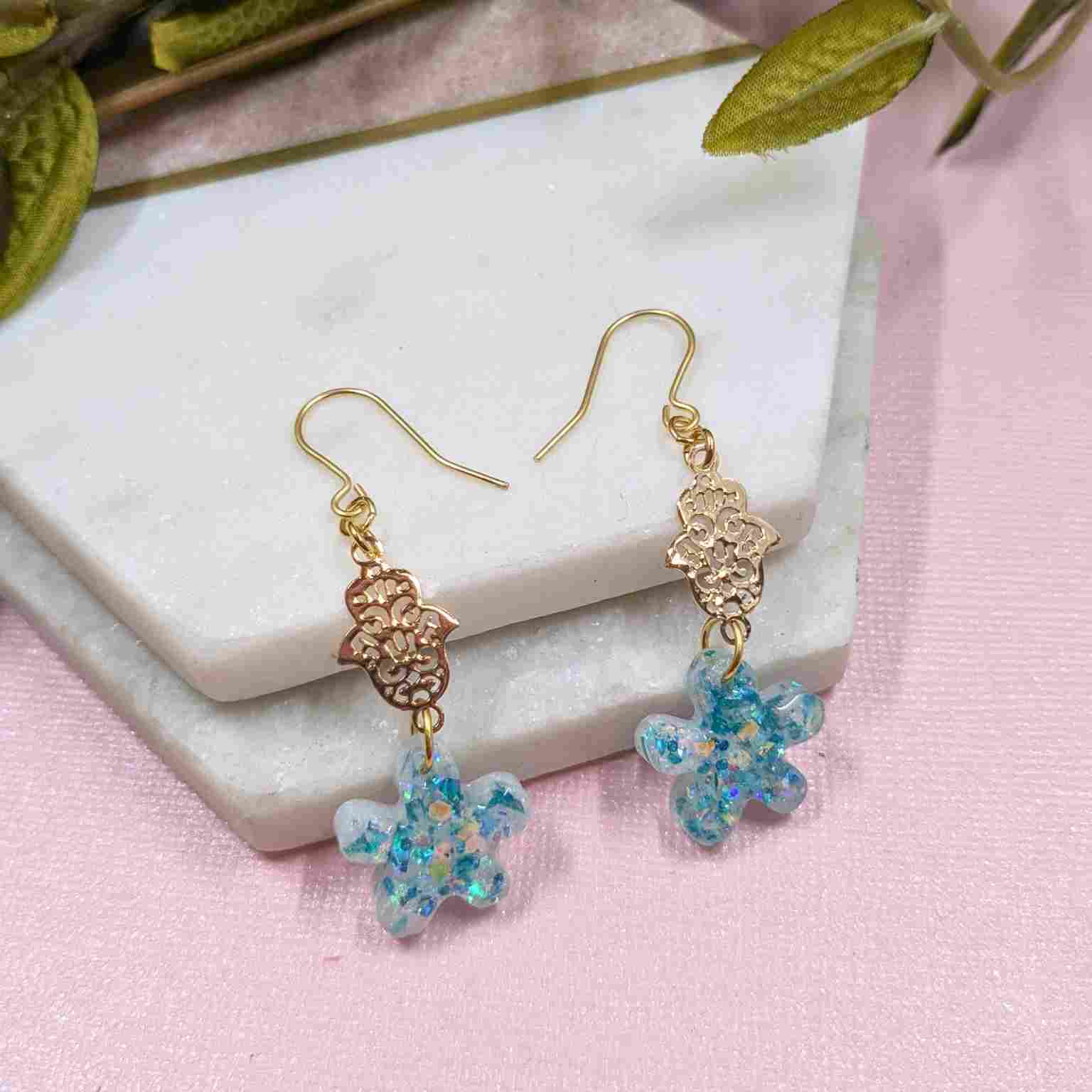 Each earring features a beautiful wavy abstract flower, carefully crafted from high-quality resin, shimmering mica, and a touch of delicate glitter in a serene blue and white mix. This unique floral element hangs gracefully from an intricate gold-plated Hamsa hand connector charm, symbolizing protection and good fortune. The earrings are completed with elegant gold-plated hooks.