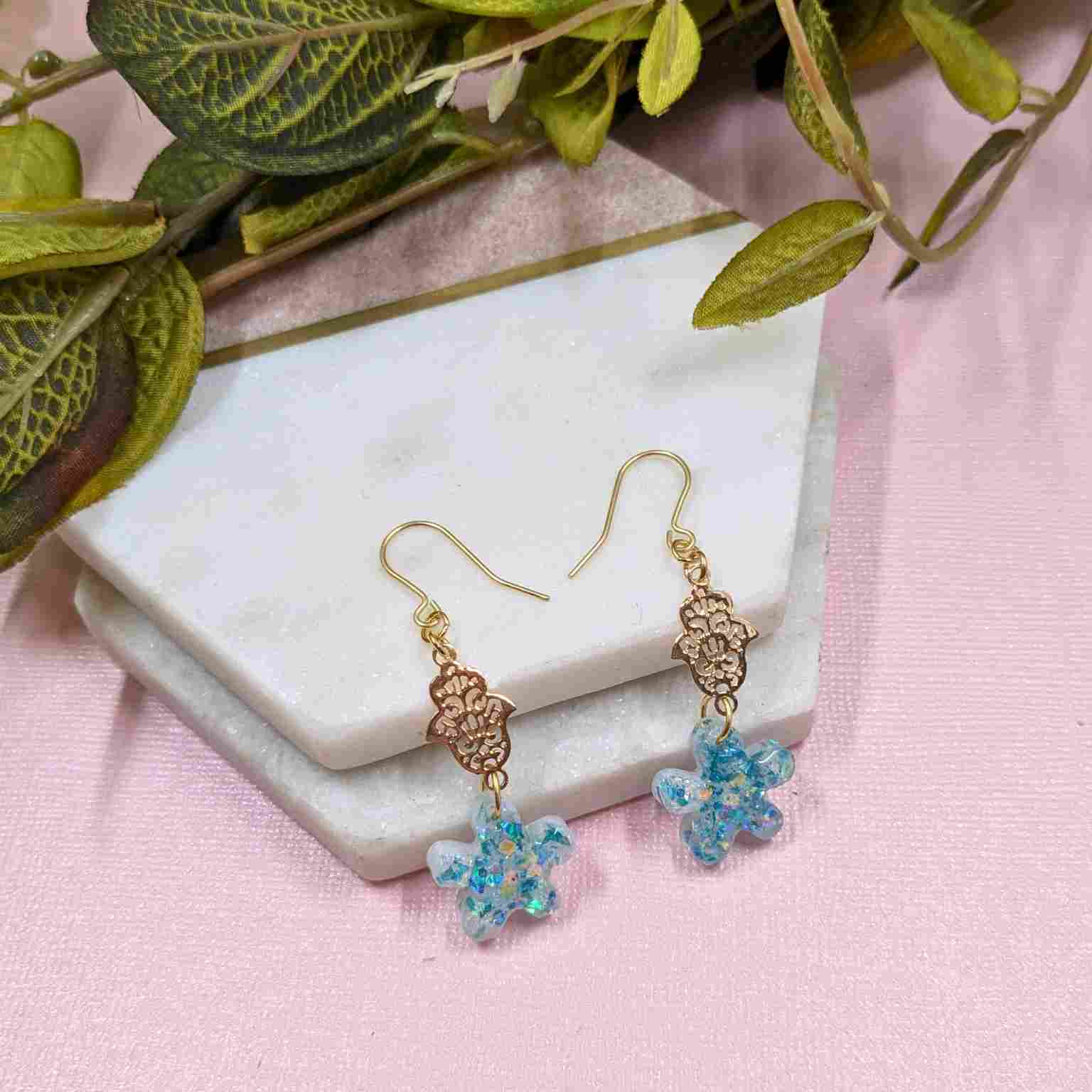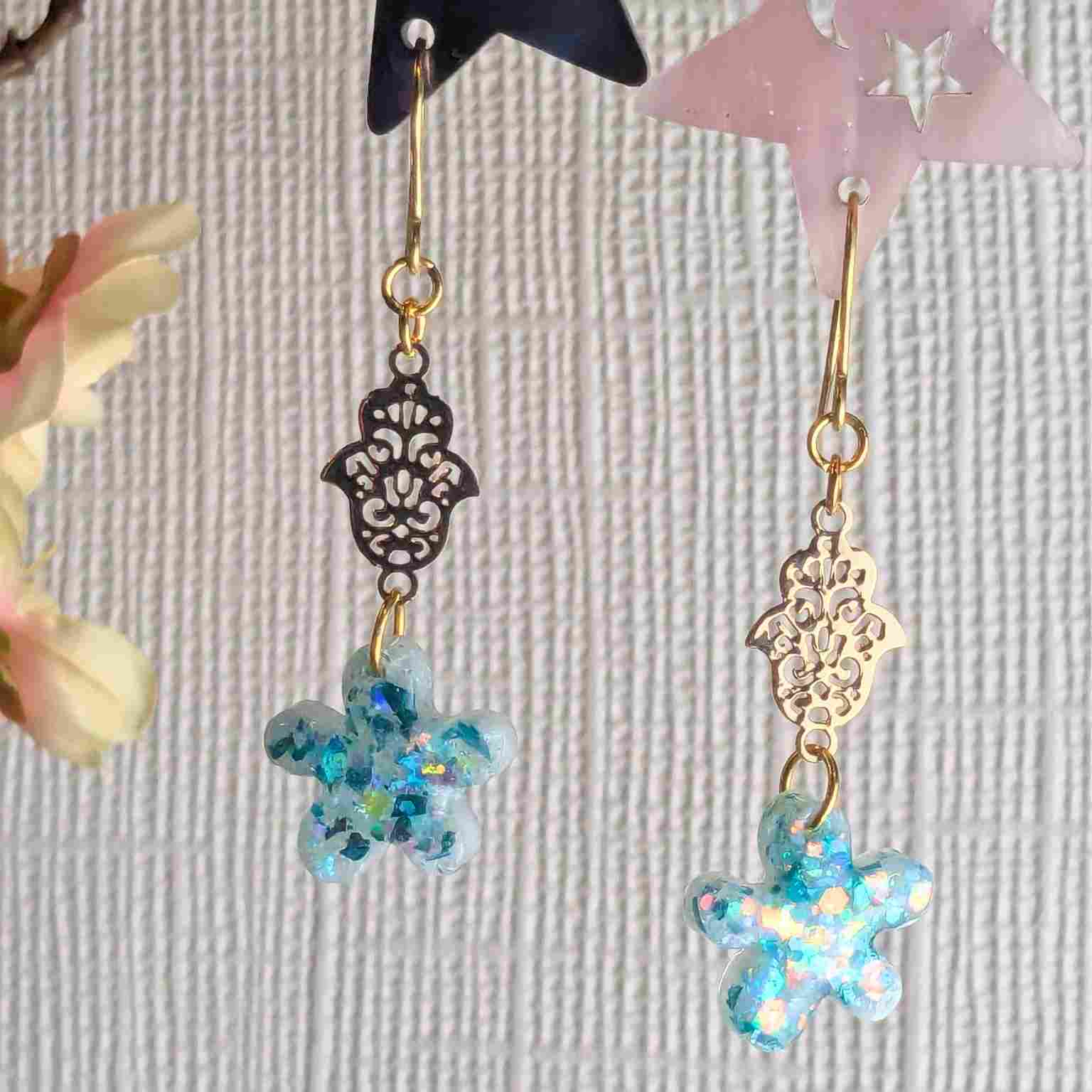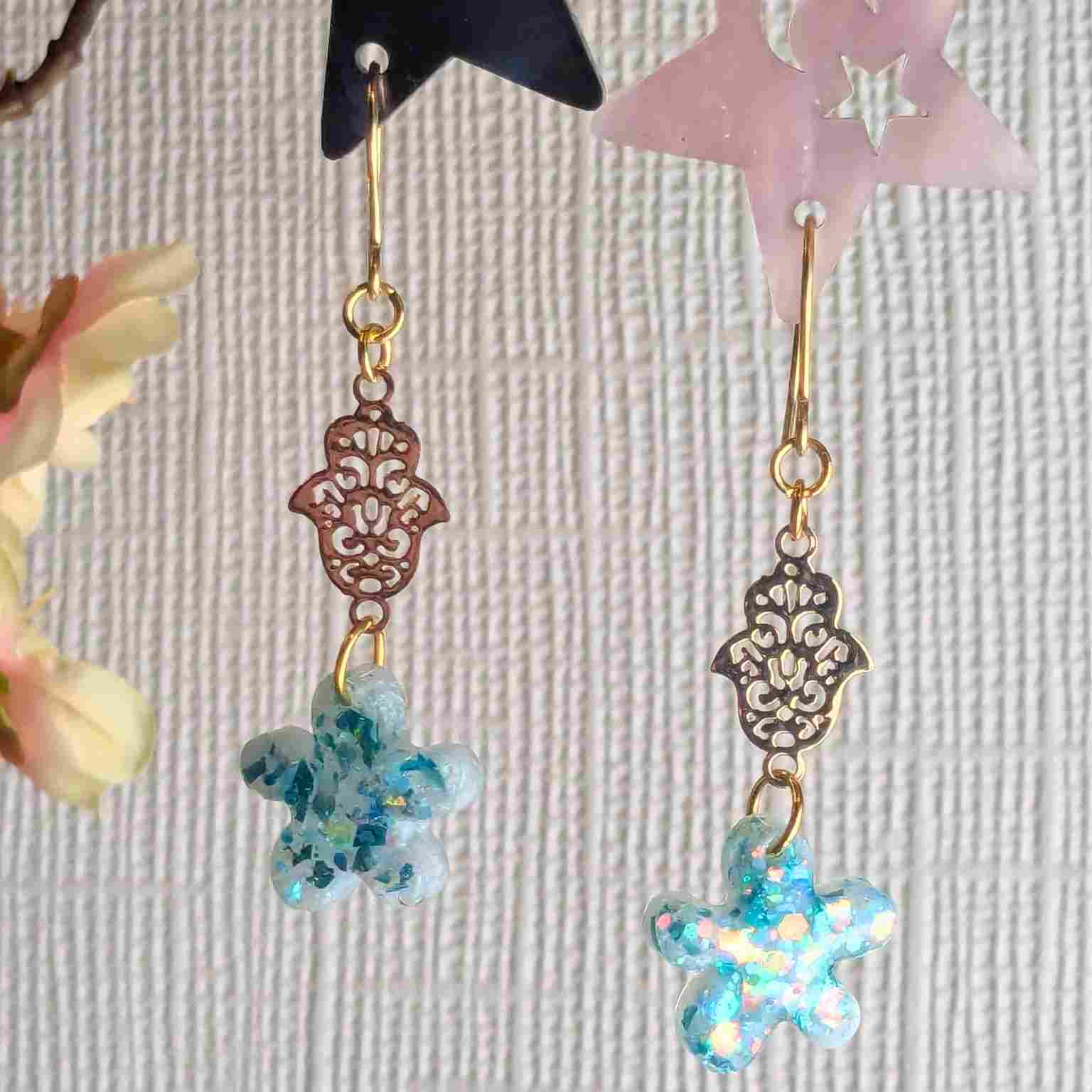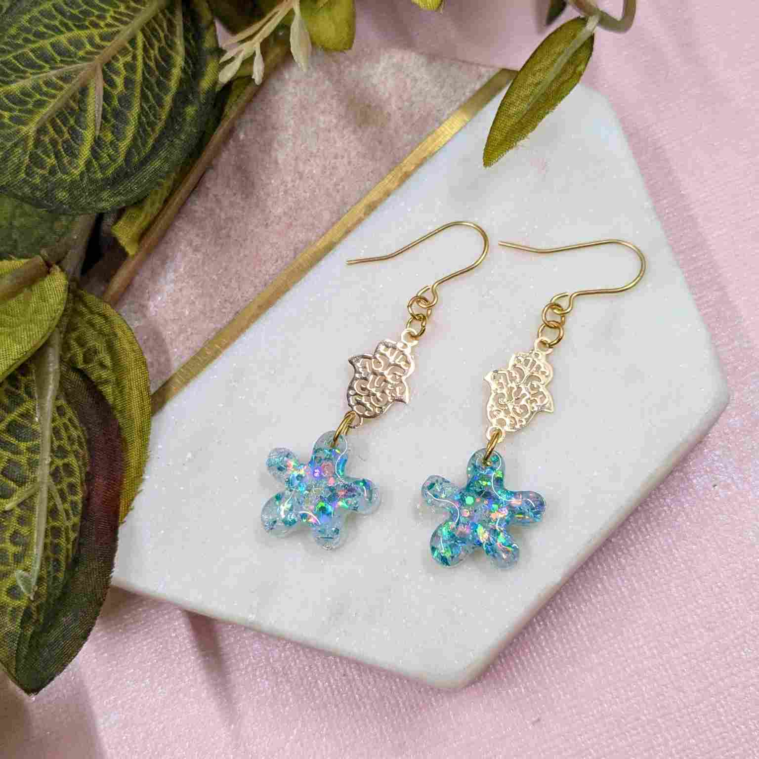 Each earring features a beautiful wavy abstract flower, carefully crafted from high-quality resin, shimmering mica, and a touch of delicate glitter in a serene blue and white mix. This unique floral element hangs gracefully from an intricate gold-plated Hamsa hand connector charm, symbolizing protection and good fortune. The earrings are completed with elegant gold-plated hooks.