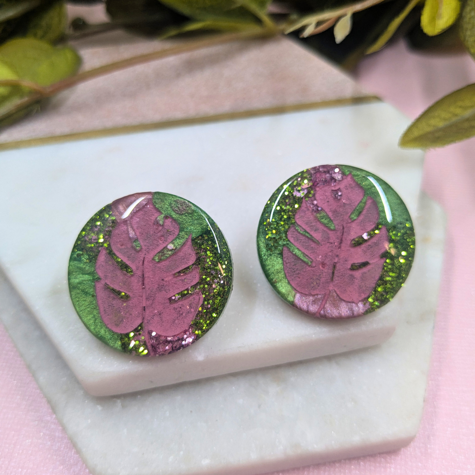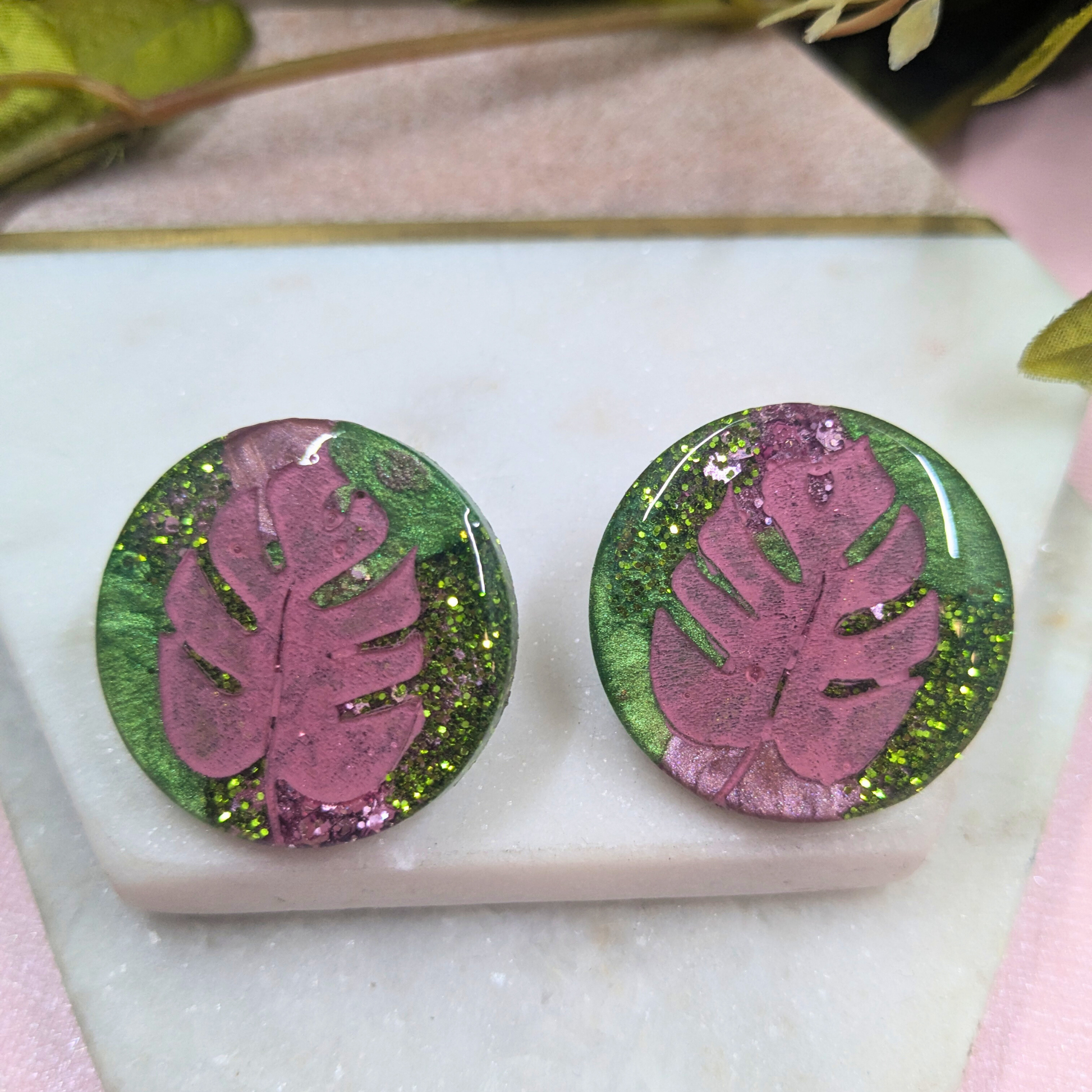 Each unique earring features a striking pink monstera leaf design, set against a backdrop of shimmering green glitter within crystal-clear resin. We've infused these beauties with high-quality mica and glitter for that undeniable sparkle and depth, creating a truly eye-catching effect.