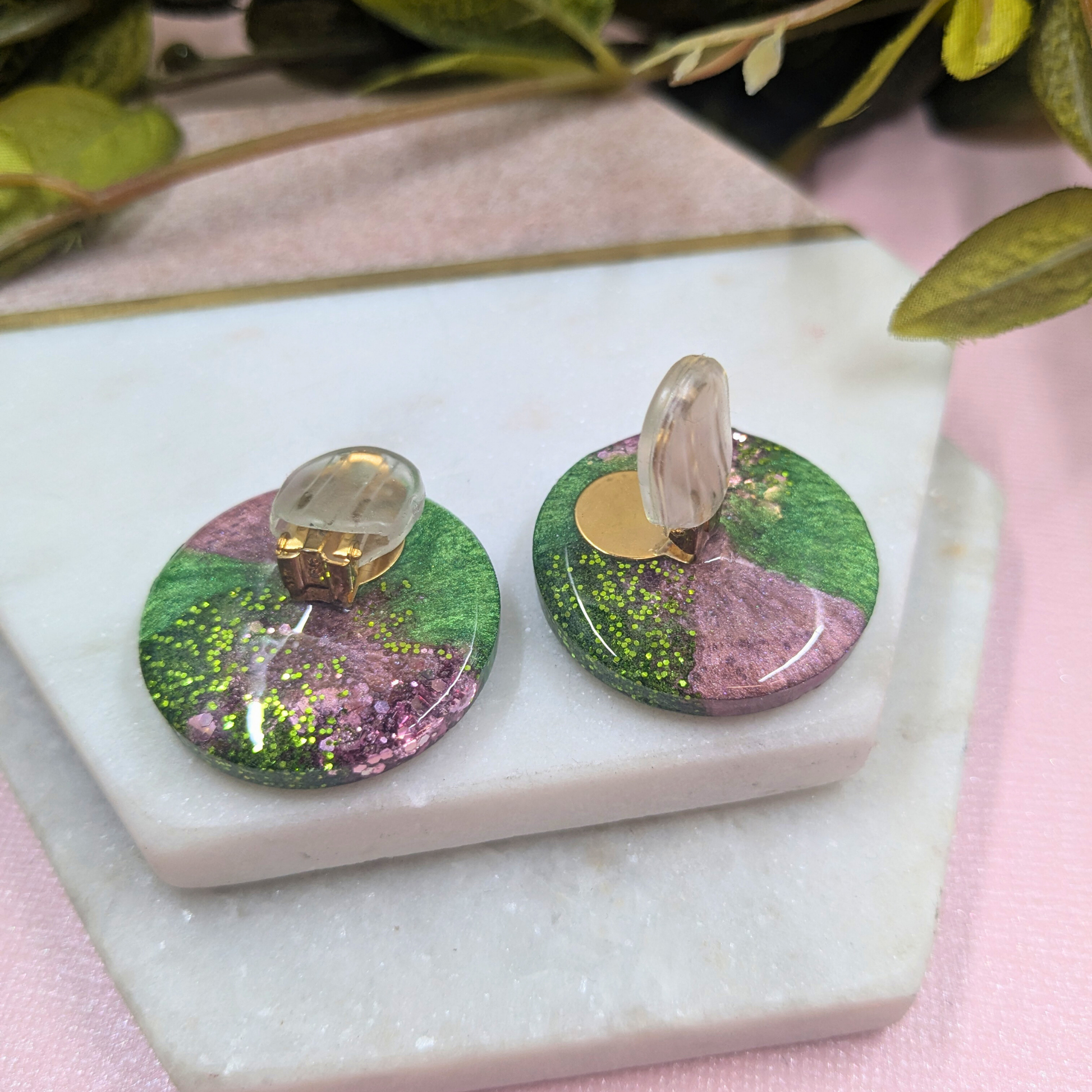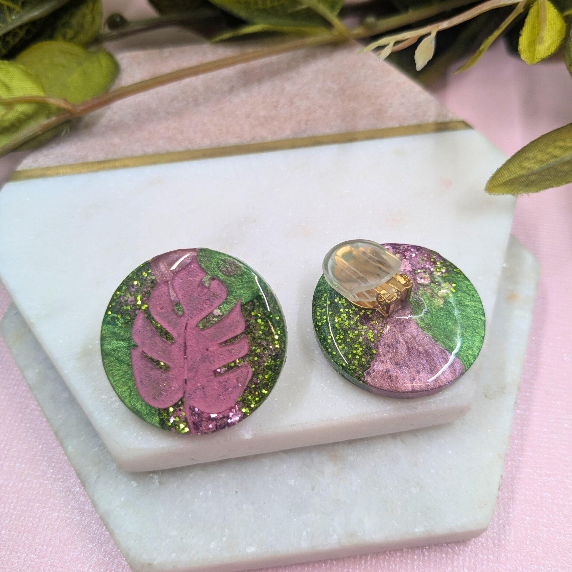 Tania Pink Monstera Green Glitter Resin Clip-On Earrings | Botanical Jewellery by Created By Lau