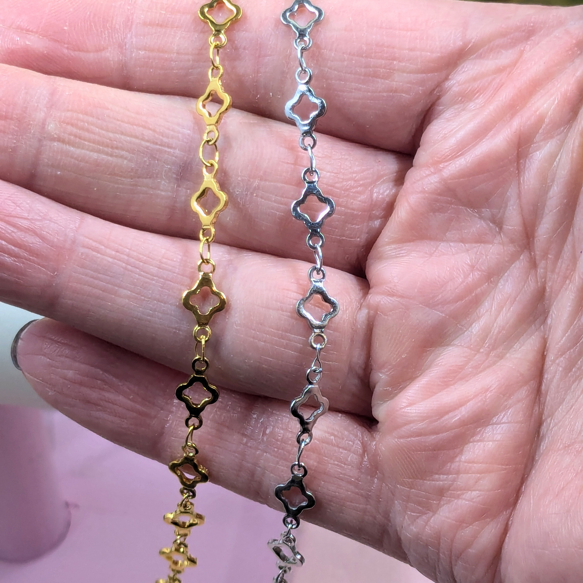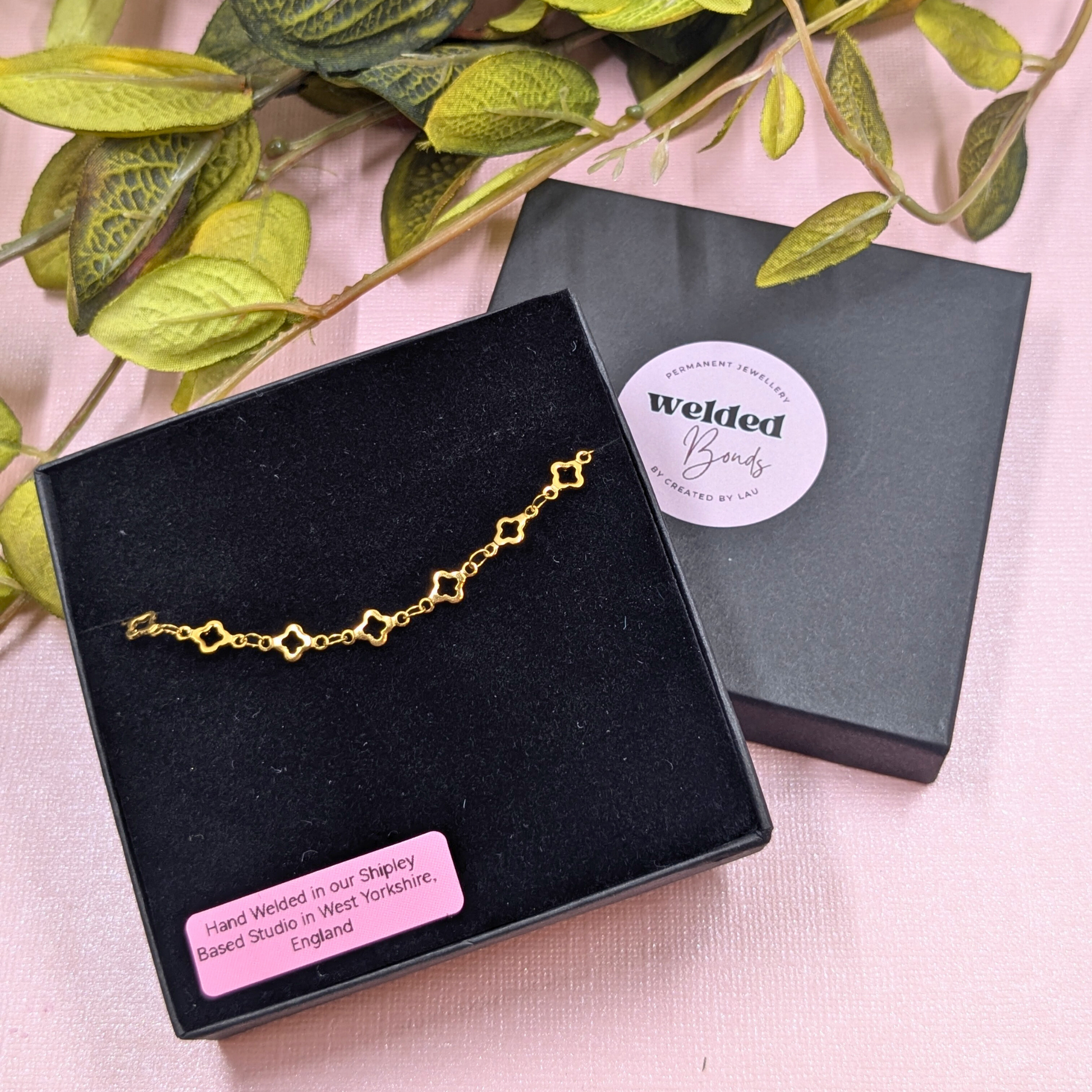 Embrace classic elegance with the "Toulouse" Gold Stainless Steel Clover Chain Bracelet, a timeless piece from our Welded Bonds Ready-to-Wear Collection. Each bracelet is lovingly hand-welded in my Shipley, Yorkshire studio, ensuring that exceptional Created By Lau quality and unique, high-fashion flair.