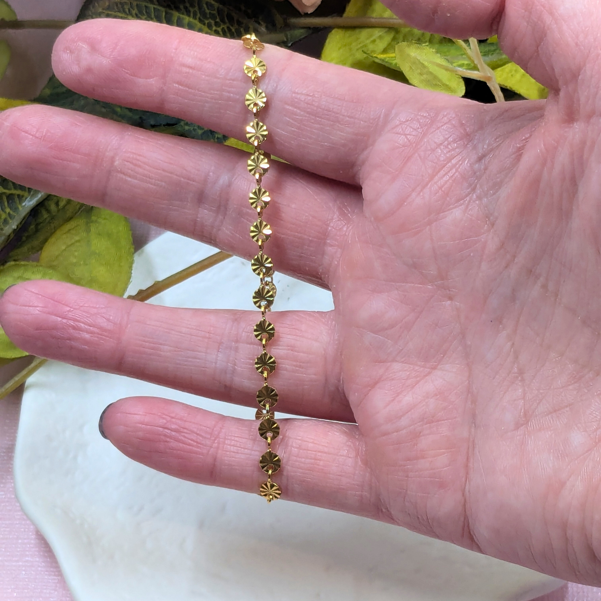 Perfect for those who adore the sleek, continuous look of permanent jewellery but love the flexibility of a clasp, the "Vancouver" Gold Sunburst is an ideal choice. It features a stunning gold chain adorned with captivating sunburst charms, creating a bold and symbolic statement piece that's designed to make you shine. It’s perfect for adding a powerful, artistic touch to any ensemble.