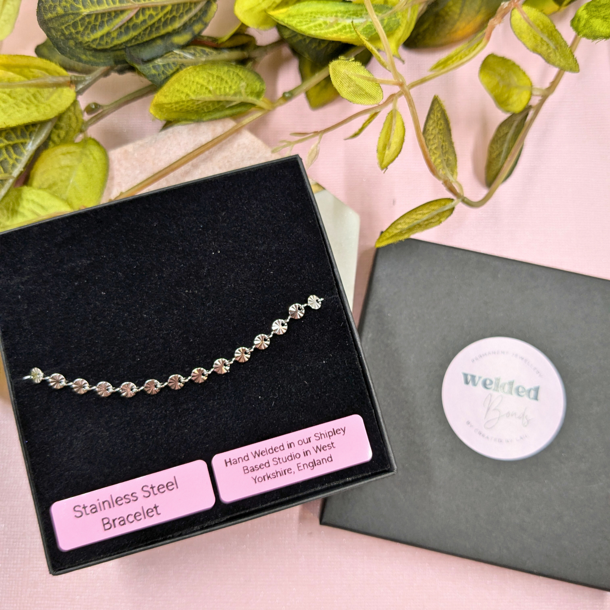 Shine bright with the "Vancouver" Silver Stainless Steel Sunburst Chain Bracelet, a truly captivating piece from our Welded Bonds Ready-to-Wear Collection. Each bracelet is lovingly hand-welded in my Shipley, Yorkshire studio, embodying that exceptional Created By Lau quality and distinct, high-fashion appeal.
