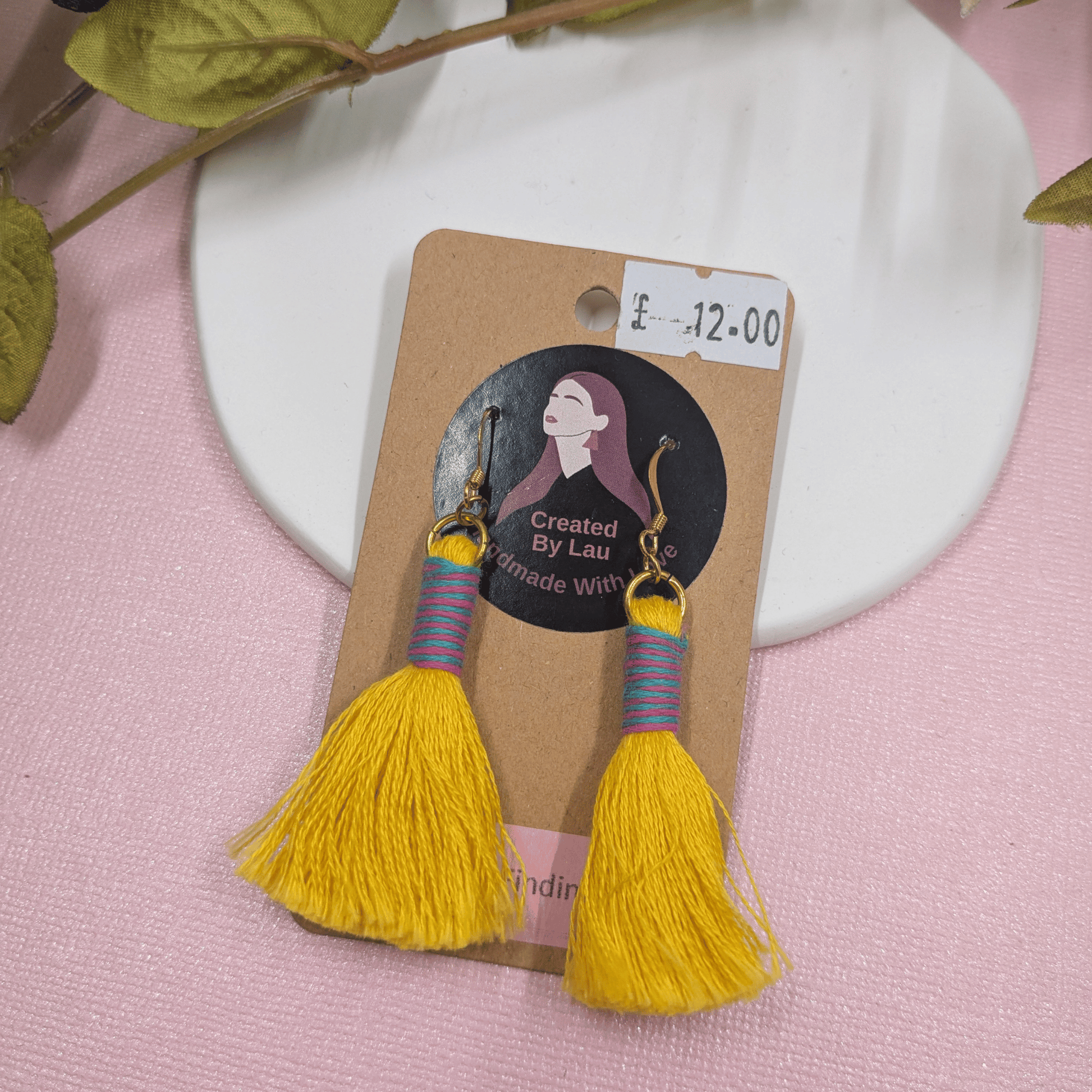 Sweet and petite, just like you! These "Willow Mini" earrings bring a pop of sunshine with their vibrant yellow tassel. Hand-wrapped with a playful twist of teal and pink, they add a unique splash of colour to any outfit. Finished with elegant gold-plated hooks, these mini tassels are perfectly sized at 6cm for a subtle yet stylish statement. Lovingly handmade by Lau in her Yorkshire studio, they're ideal for adding a touch of handmade charm to your day.